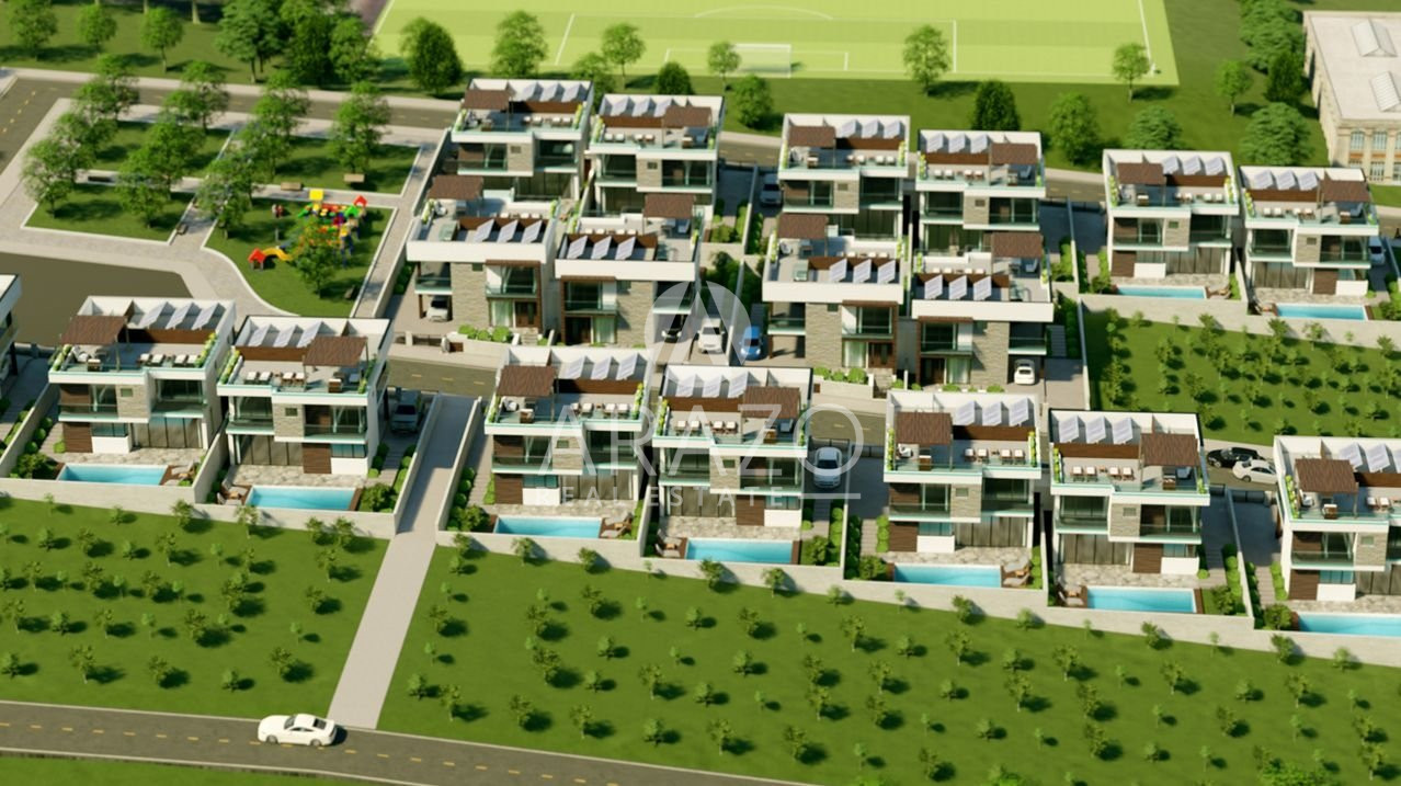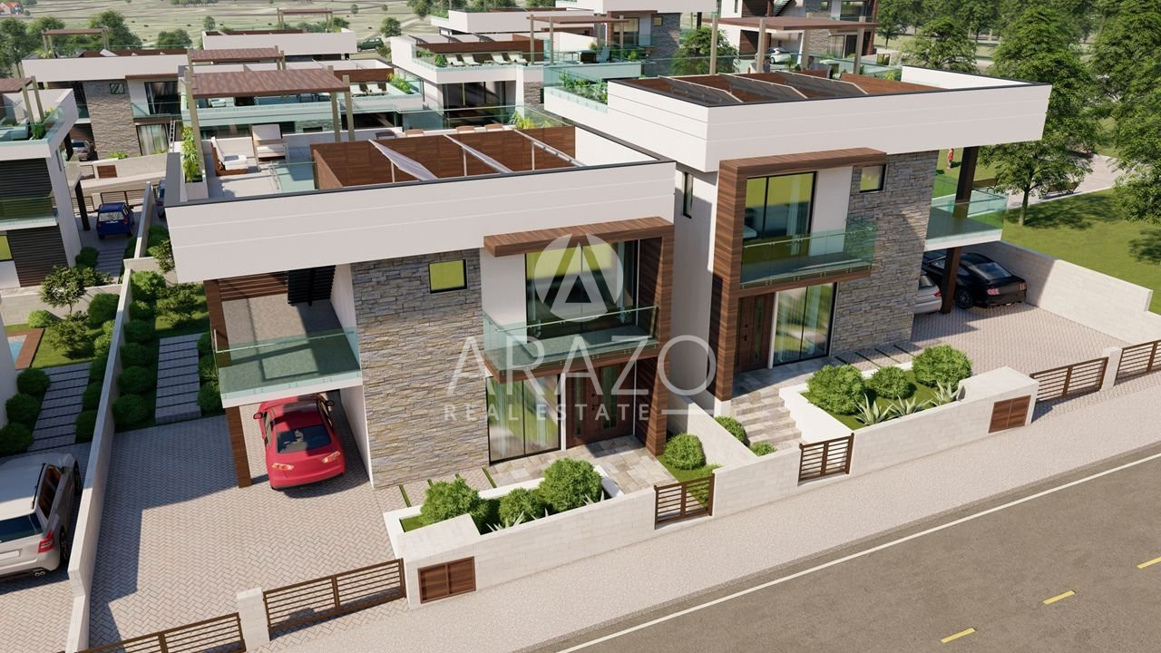 All houses consist of three master bedrooms, out door swimming pool, kitchen, dining and living room, air condition provision, water pressure system, water heating, new smart system, CCTV, photovoltaic panels, sound systems indoor and outdoor, Roof Garden with a fantastic view Mediterranean Sea and Larnaca City.