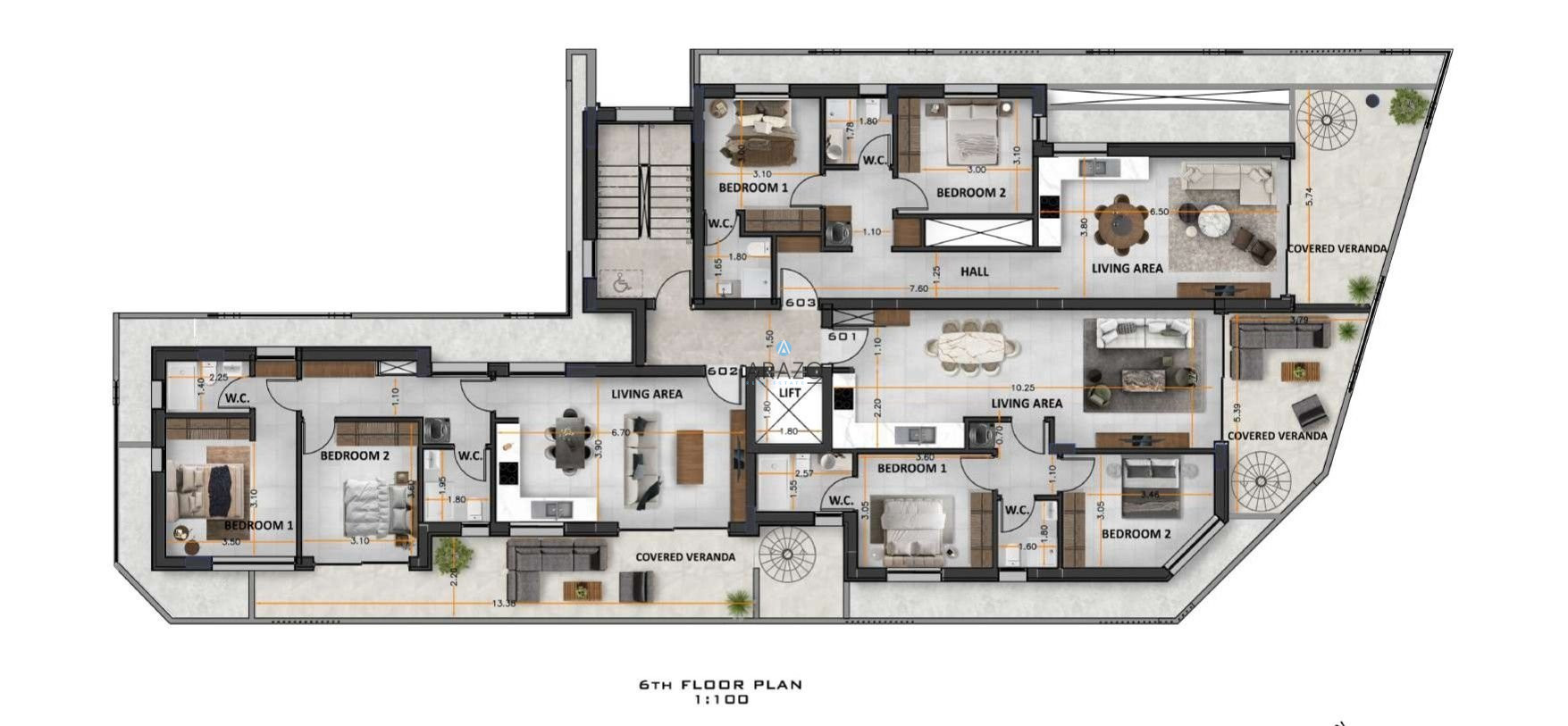 The project boasts nineteen apartments two bedroom & two bathroom apartments – all with spacious and contemporary living areas. There are four apartments per storey on 1st floor and 4th floor and 3 apartments per storey on 2nd, 3rd, 5th and 6th floor – ensuring optimum privacy for potential buyers. The eight floor apartments benefit from individual private and luxury roof-gardens with amazing views of the lovely neighborhood. Each apartment has one parking bay and a storage room on the ground level.