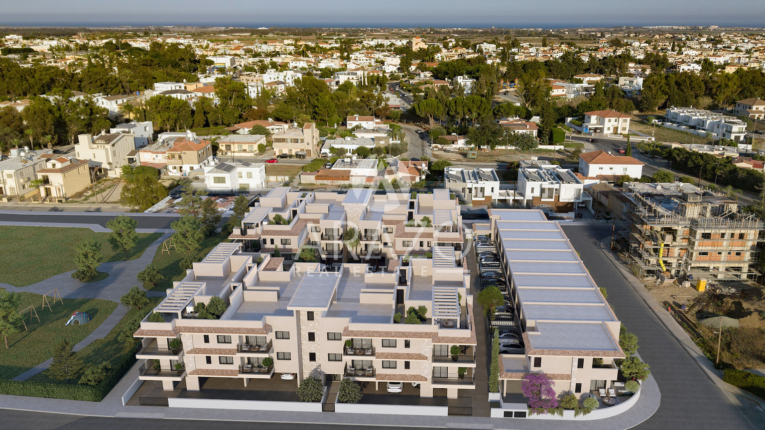 Blending Mediterranean architecture with modern comfort, the project features 50 elegant homes – a collection of stylish apartments, penthouses, maisonettes, and houses – designed to suit every lifestyle. Set within a private neighborhood and next to a large green park, the community offers a peaceful atmosphere surrounded by private residences, yet remains well-connected for both daily living and leisure.