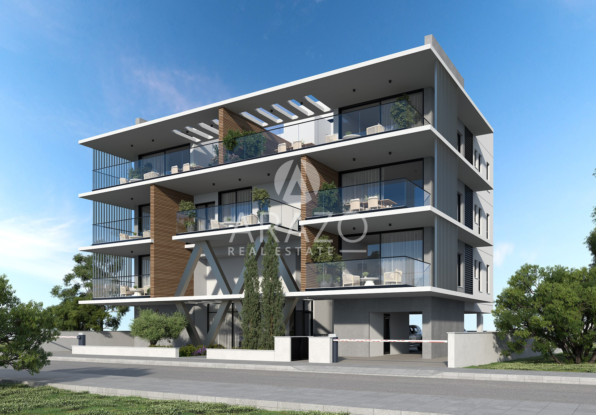 The architecture follows clean lines, structured forms and balanced proportions. The exterior design includes large balconies, full height openings and warm materials that add character. Green touches soften the façade and improve the atmosphere of the building. The result is a modern structure that will remain relevant for years.