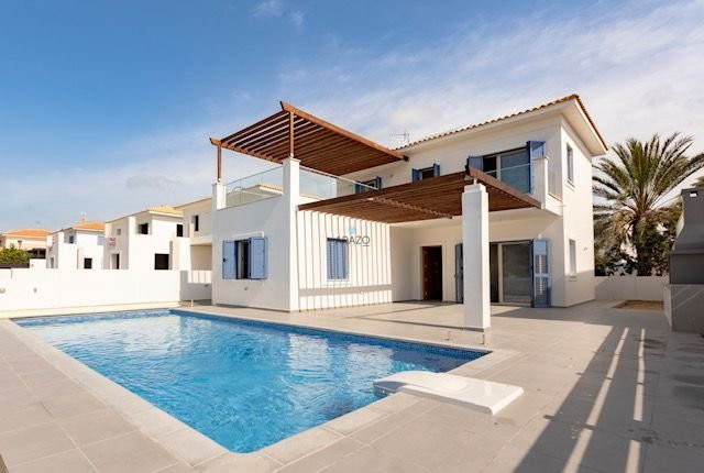 The covered area of the houses range from 127sq.m to 146sq.m. The plots size range from 358sq.m to 483sq.m. Each house will have a private swimming pool and will be built to the highest quality and standards. A double storey, three bedroom detached house, with tiled roof, balconies with sea views, covered verandas and covered parking space, in spacious land areas. The new modern design of the property include pergolas, glass balconies, open plan sitting room and dining room and also two bathrooms.