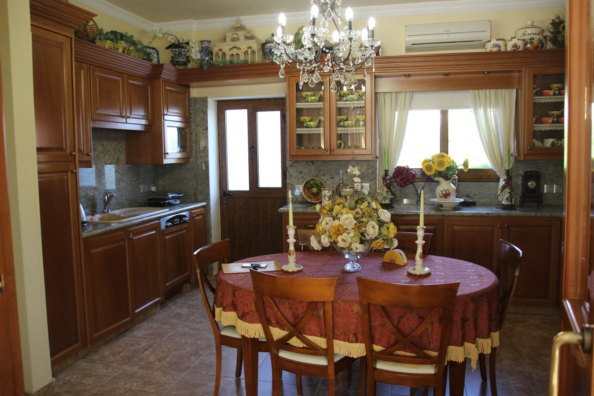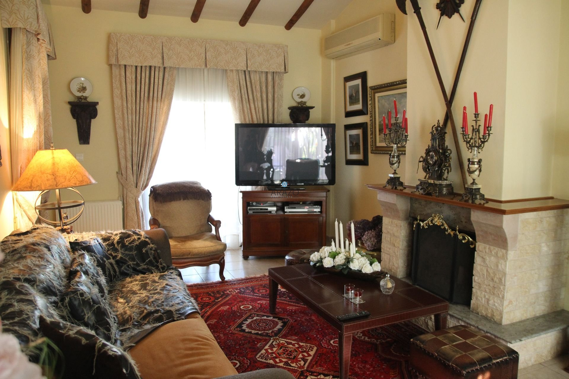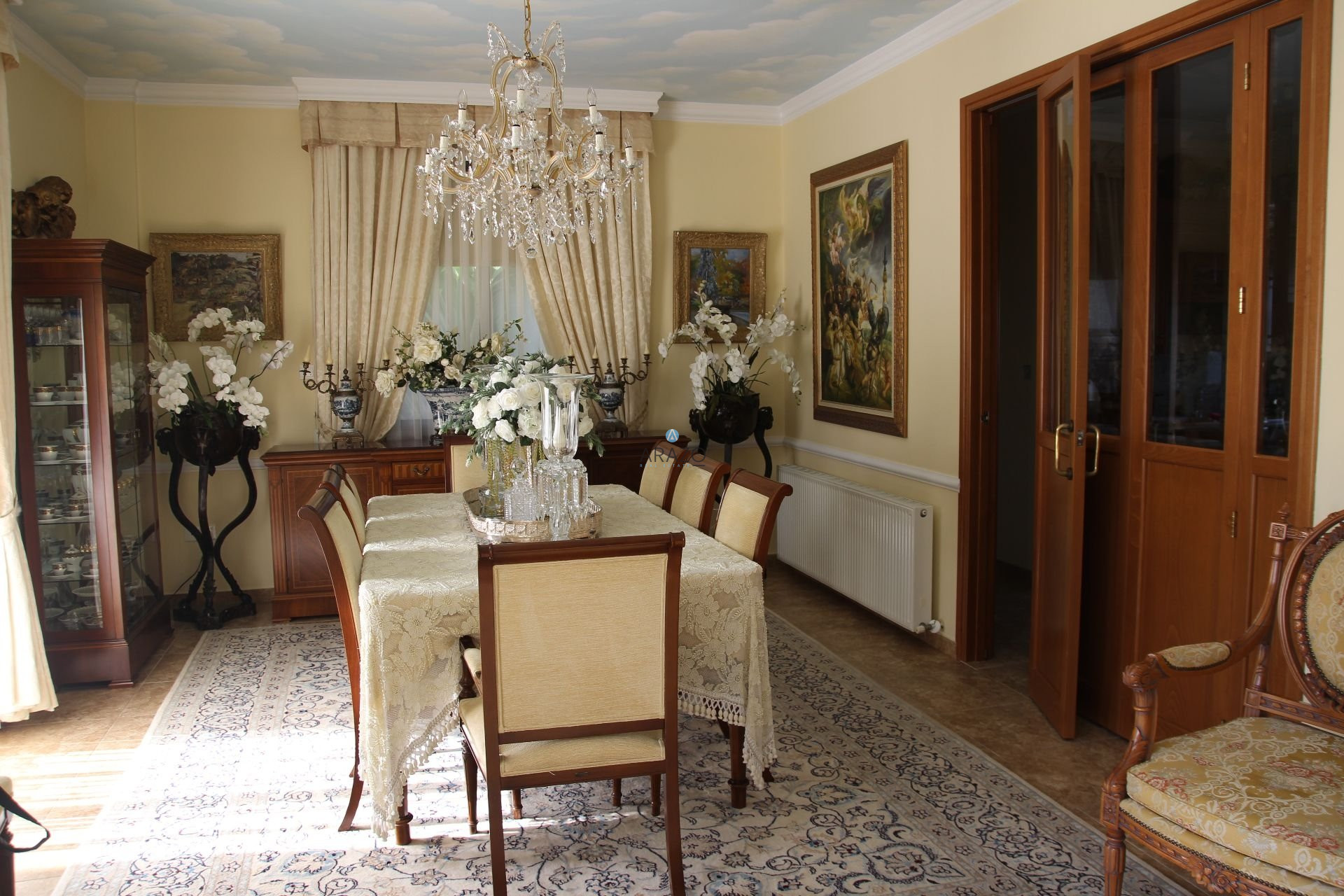 The property features a spacious, open plan living room with a dining area, a separate fully equipped solid wood fitted kitchen with a smaller dining area, a separate cosy tv room with a fireplace, a guests w/c and a maid's room. Taking the stairs to the first floor you will find three good sized bedrooms, the master bedroom with an en suite shower room, which is currently used as a storage room, the other three bedrooms sharing a family bathroom as well as an office / study room.