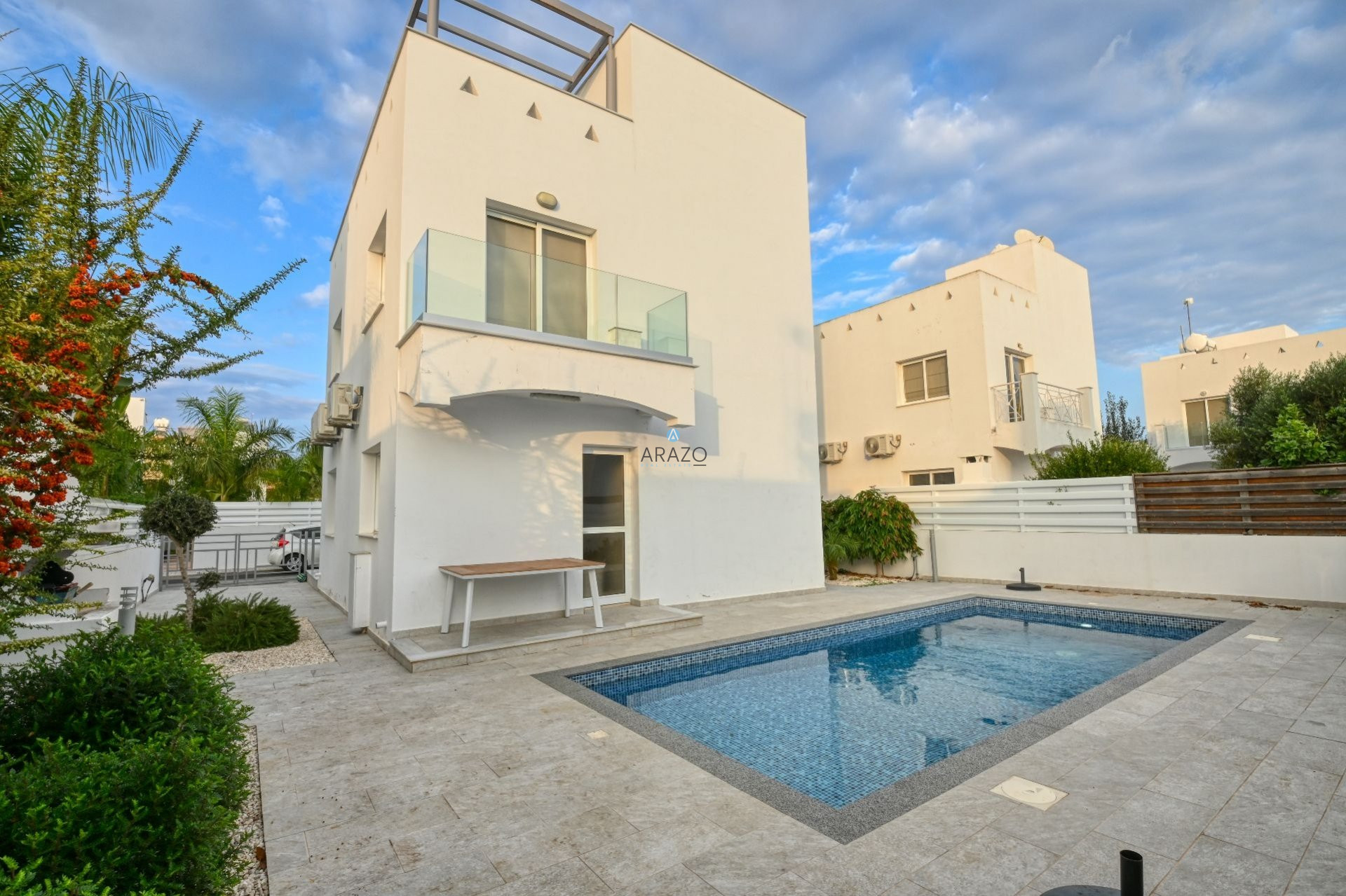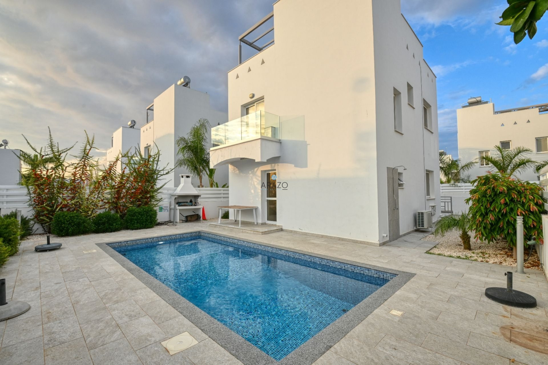 The first floor features 3 bedrooms and a family bathroom whereas the staircase leads to a beautiful roof garden with nice views of Ayia Napa and Nissi Avenue. The villa includes private swimming pool, private parking and a landscaped garden.