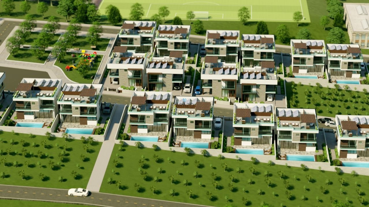 All houses consist of three master bedrooms, out door swimming pool, kitchen, dining and living room, air condition provision, water pressure system, water heating, new smart system, CCTV, photovoltaic panels, sound systems indoor and outdoor, Roof Garden with a fantastic view Mediterranean Sea and Larnaca City.