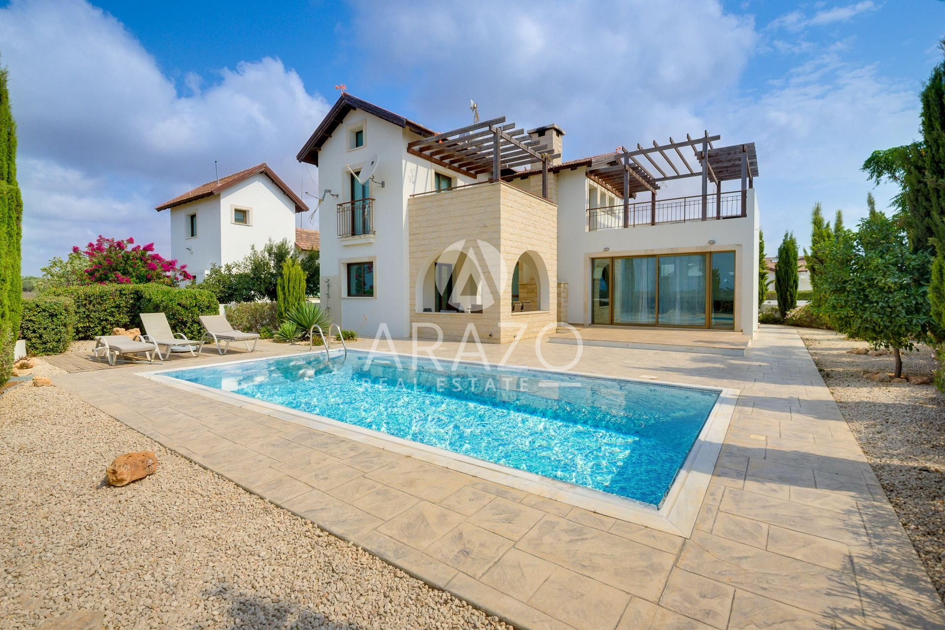 First floor offers two good sized bedrooms and a shared family bathroom, as well as uncovered veranda with pergola. The villa benefits from a large private swimming pool and a spacious plot with lots of outdoor space.