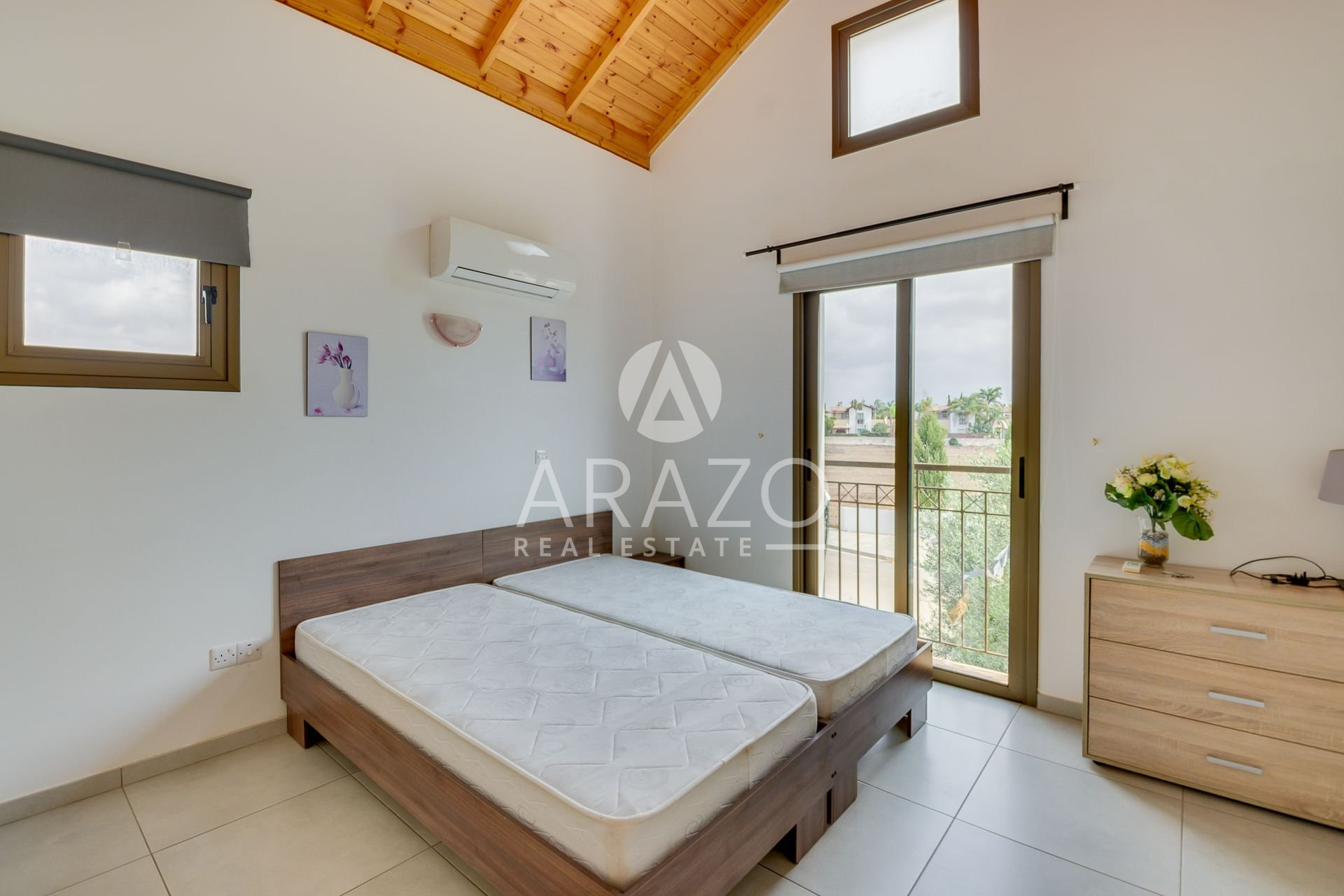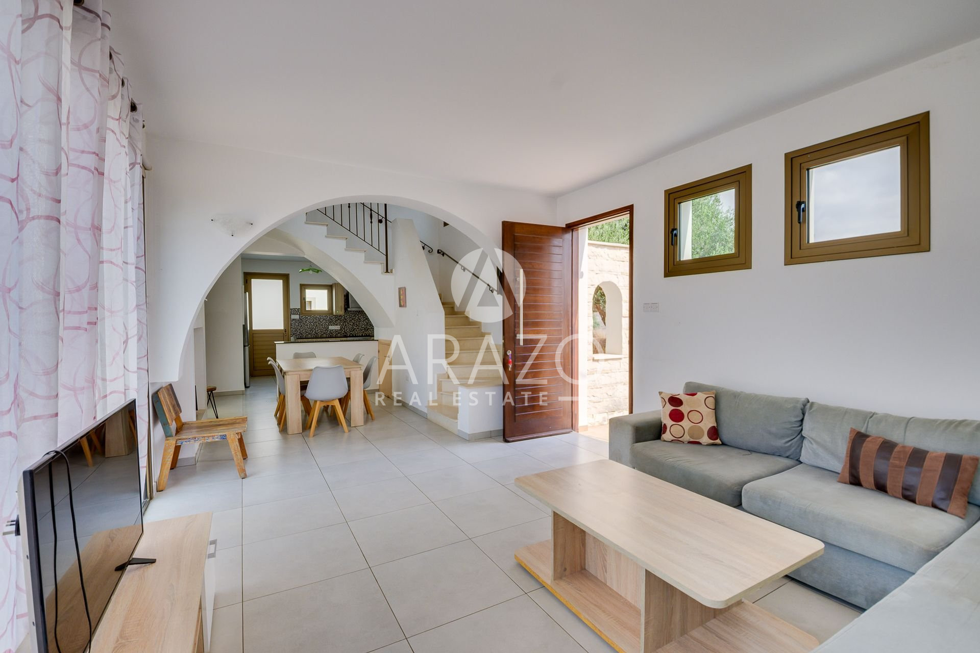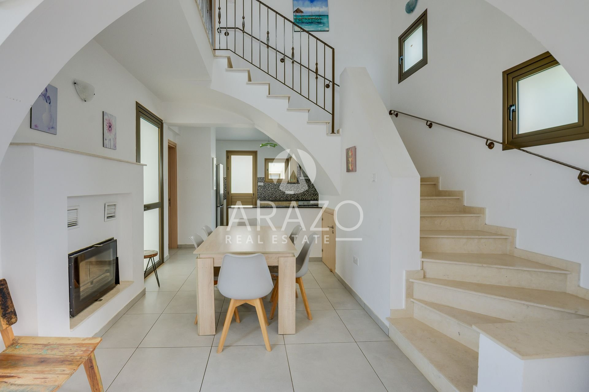 This unique in style corner plot villa features an open plan spacious living room with ample natural light and a built-in fireplace, a fully equipped kitchen and dining area. There is a bedroom on ground floor, as well as bathroom.