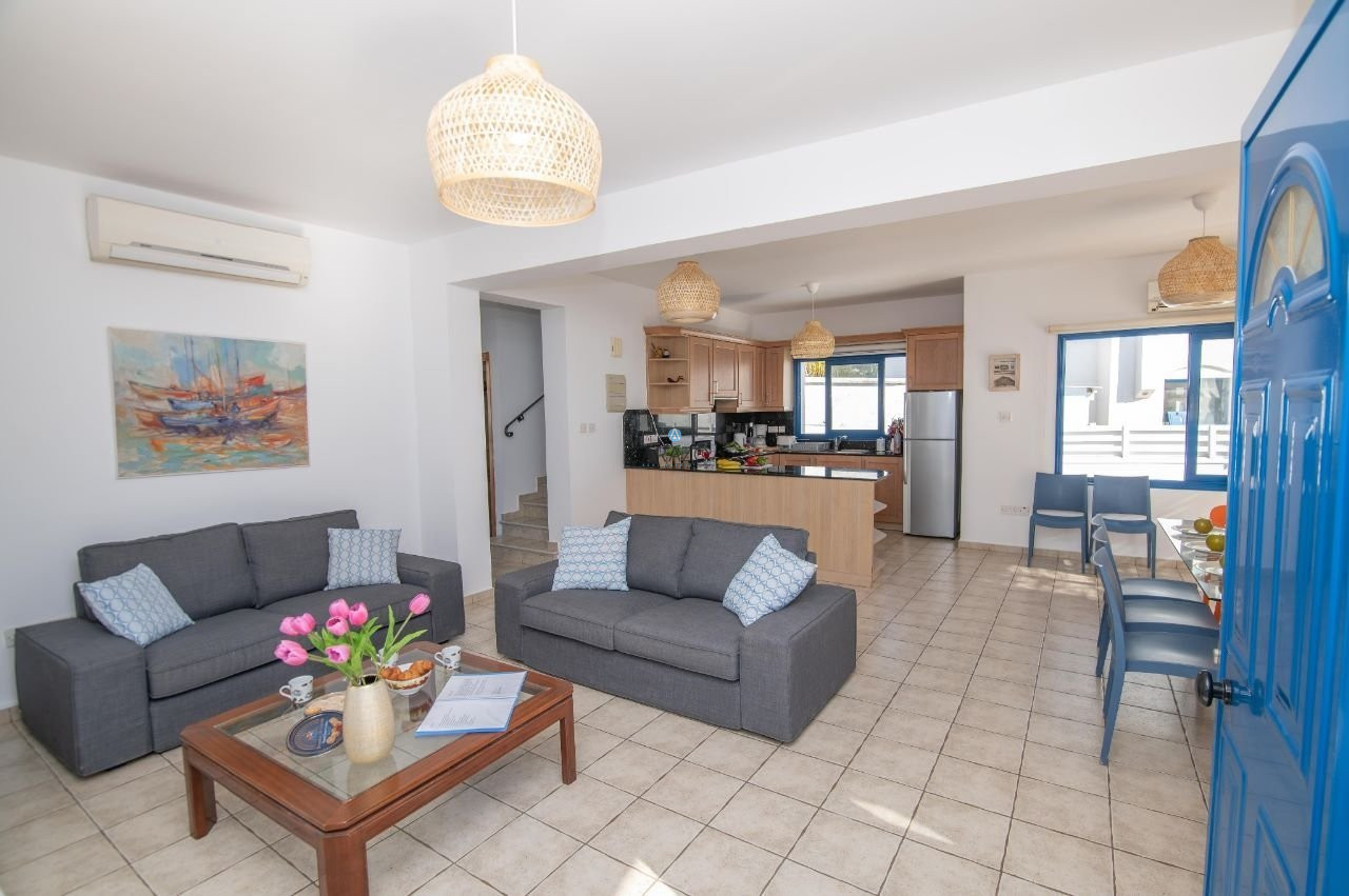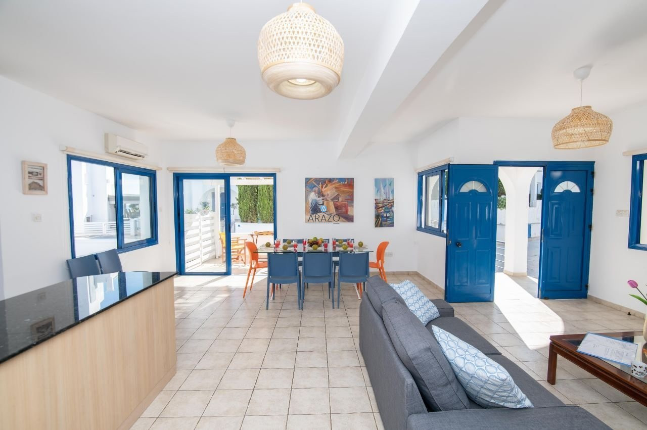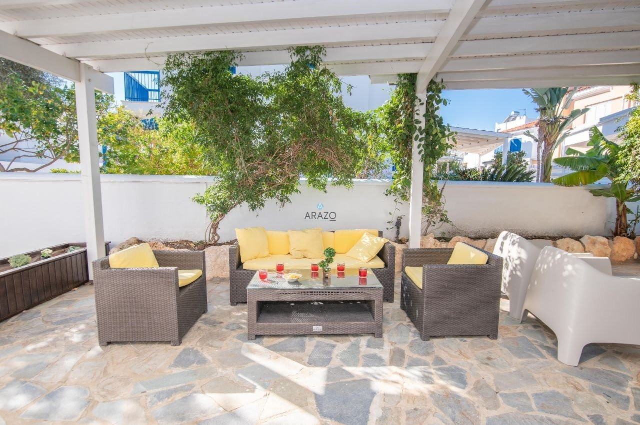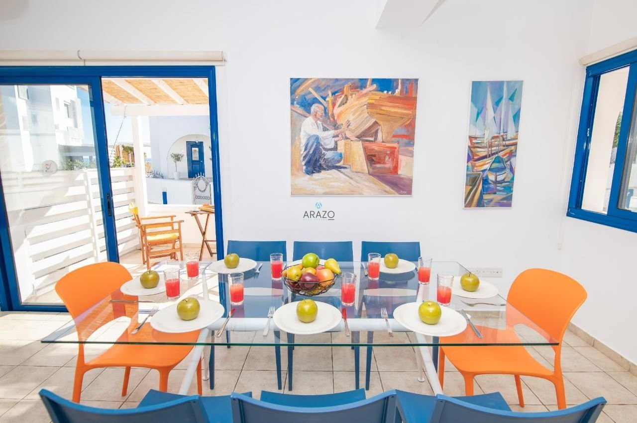 Luxury Myconian style house 130 meters from the sea with stunning sea views and a private swimming pool. Ideally located between Sirena Bay (300m), Golden Coast (600m) a 5-star hotel with full amenities such as spa and tennis, and Crystal Springs Hotel (400m) known for its Mediterranean landscaped seafront gardens and quality beach. You can enjoy indoor dining during the day as well as outdoor dining in the front garden at night. Enjoy a breathtaking sunset on the roof garden and unwind.