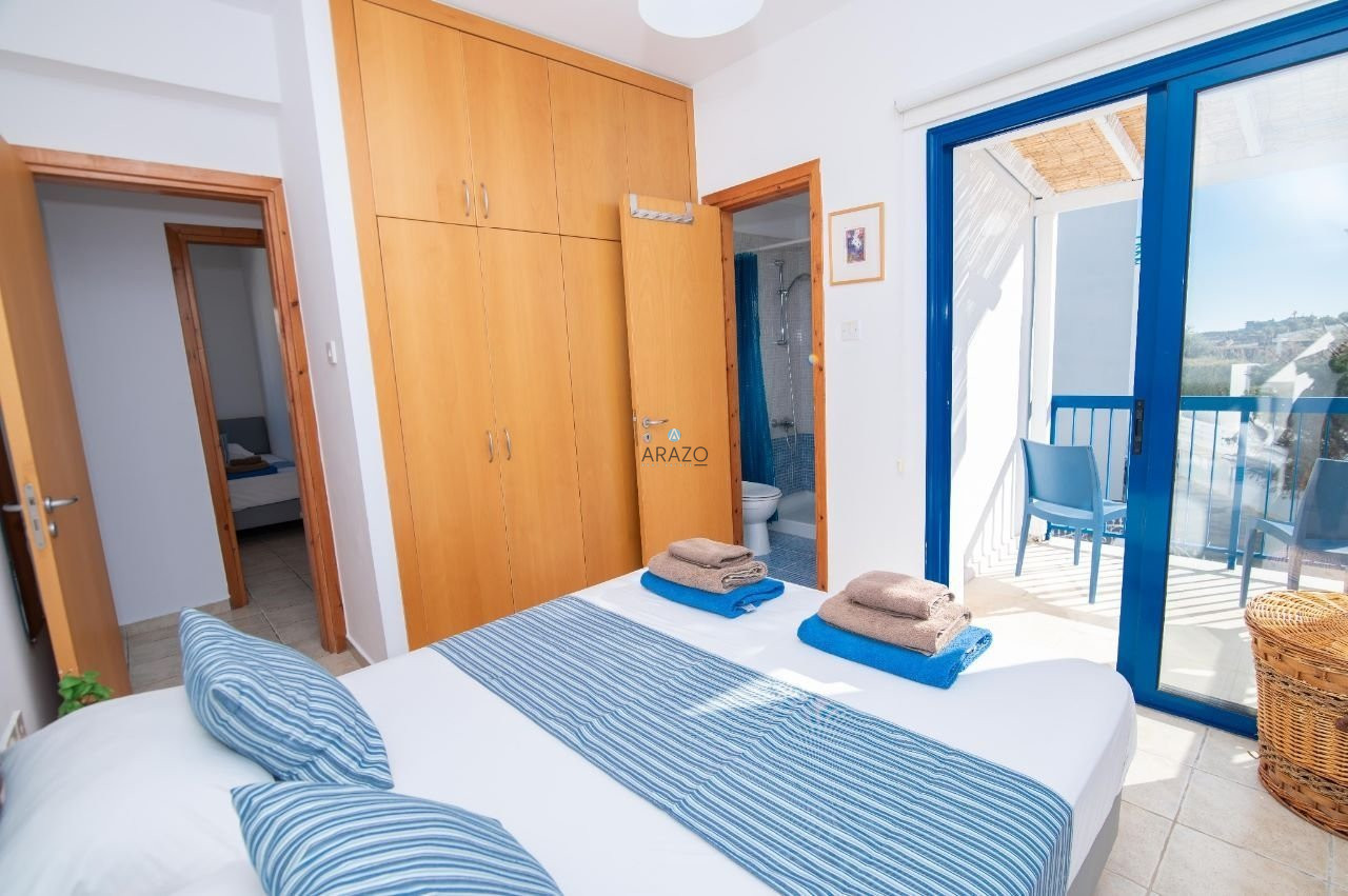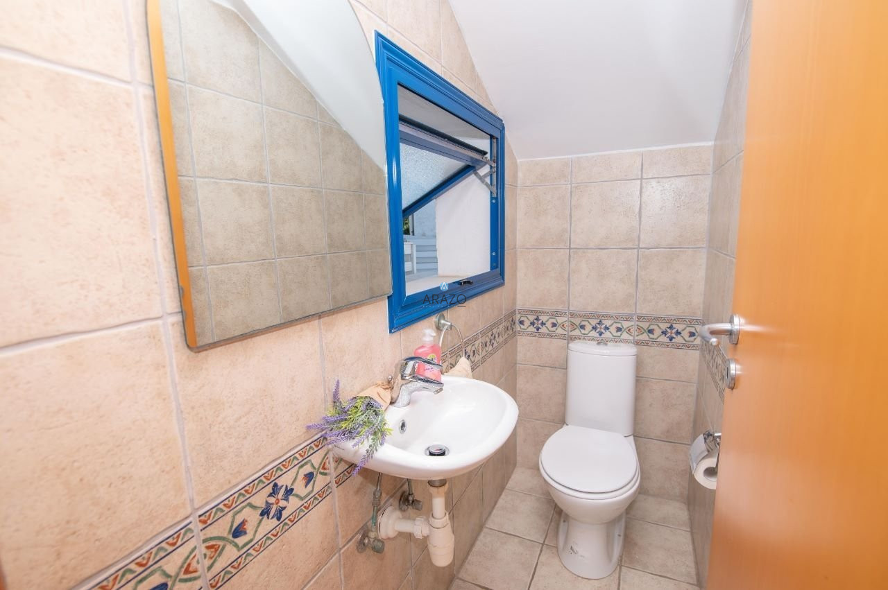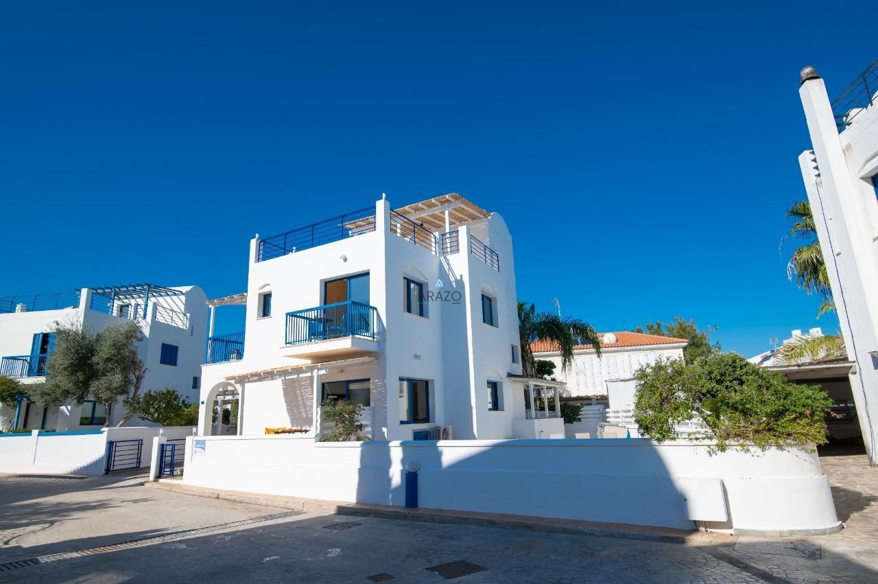 The complex was built in 2005 in an idyllic location with an Aegean architectural style of white and blue. The house is located next to the decorative chapel in an elevated location that oversees the complex with a 360-degree view from the roof garden. It has been equipped with all designer furniture and delicate garden vegetation.