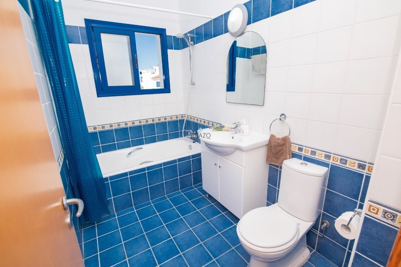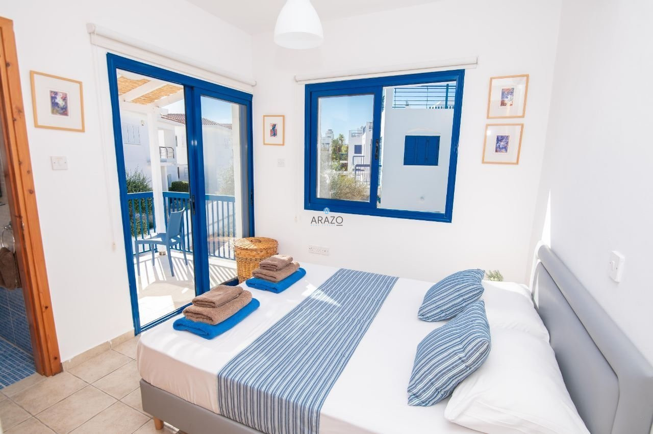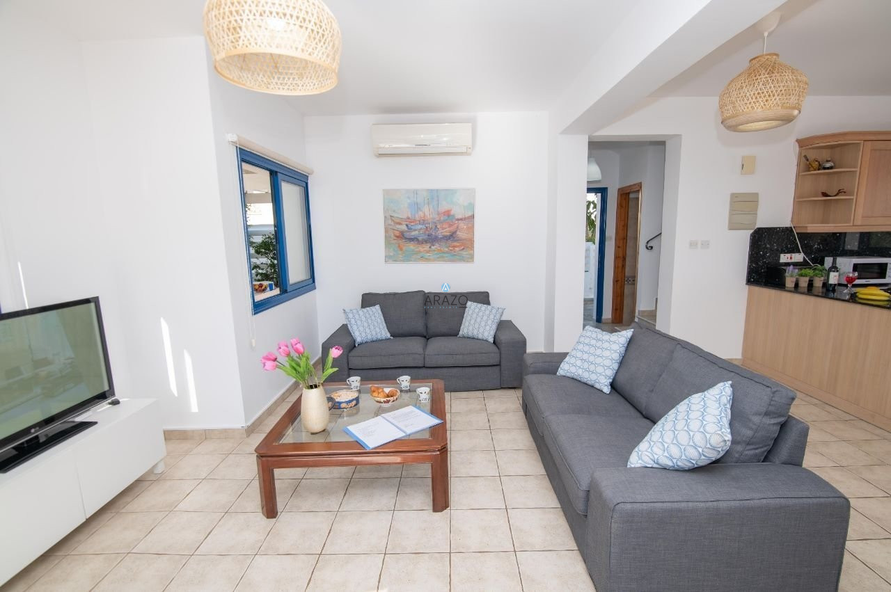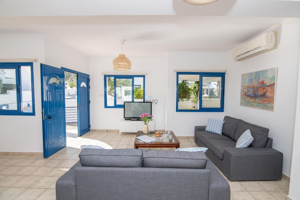 The complex was built in 2005 in an idyllic location with an Aegean architectural style of white and blue. The house is located next to the decorative chapel in an elevated location that oversees the complex with a 360-degree view from the roof garden. It has been equipped with all designer furniture and delicate garden vegetation.