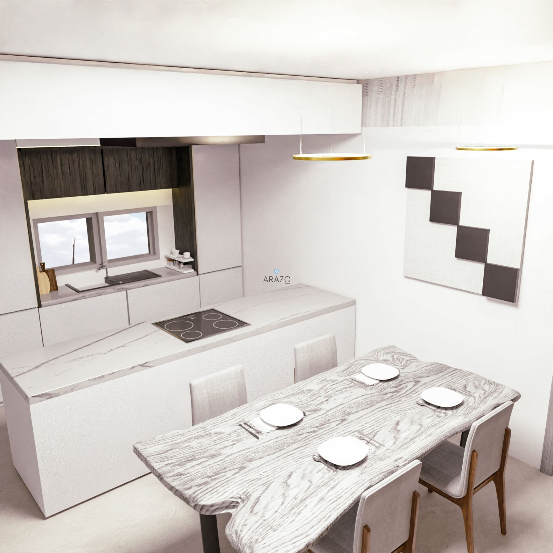 - Combined kitchen and dining area
