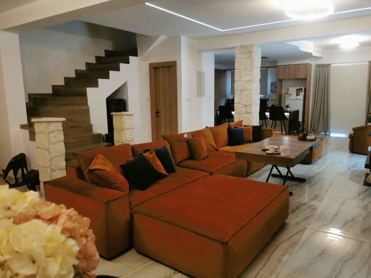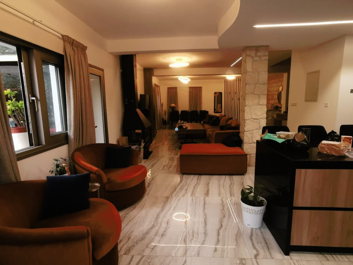 The property consists of an open plan living and dining area which is unified with the kitchen, kitchenette, guest toilet with shower, four bedrooms, en - suite shower with toilet and walk - in closet in the master bedroom, a main family bathroom with toilet, utility room and attic. Fully equipped kitchen with island, fireplace in the living room, A/C split units and ceiling fans with light and speaker. Outside the property there is garden, covered parking space and storage room.