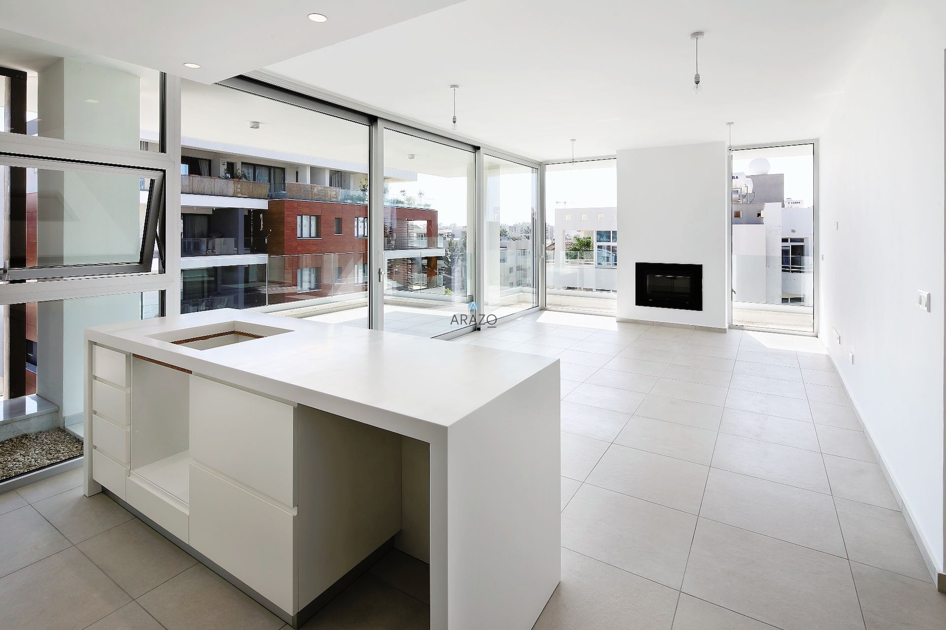 The apartment is situated on the third floor of the building and features a bright, open plan living room, a modern kitchen and dining area with an island, two bedrooms and two bathrooms. Large sliding doors connect the living area with the veranda where you can enjoy the beautiful views.