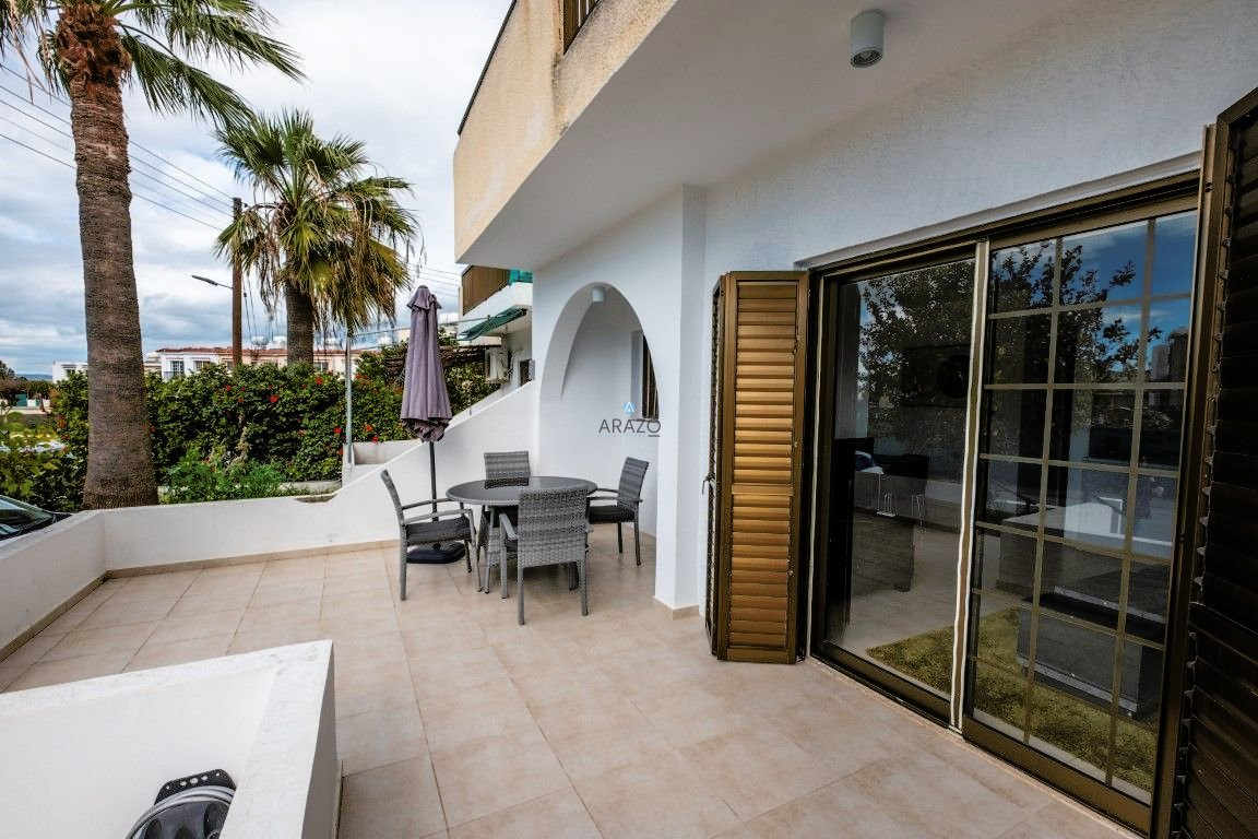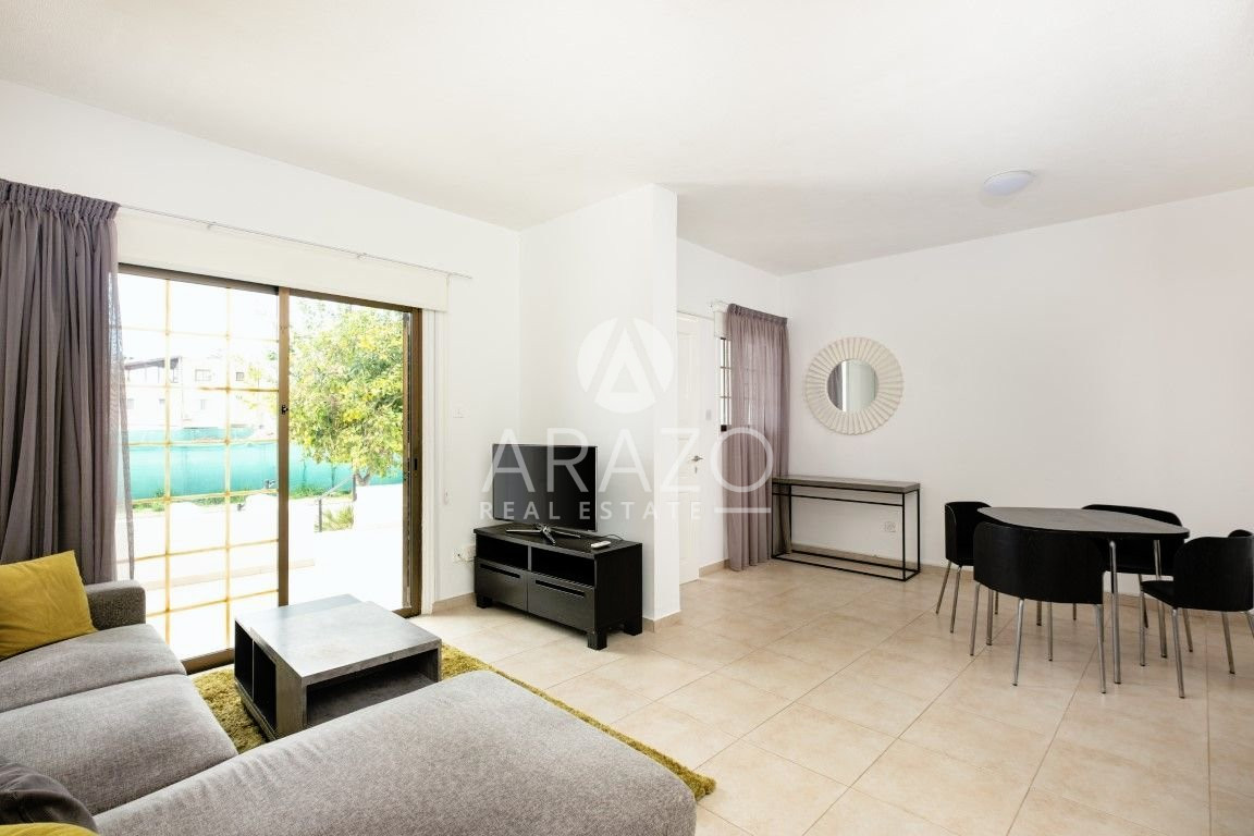 The property is located on the ground floor and consists of an open plan living and dining area which is unified with the kitchen, two bedrooms, a main family bathroom with toilet and veranda. Fully furnished, equipped kitchen, A/C split unis and parking space.