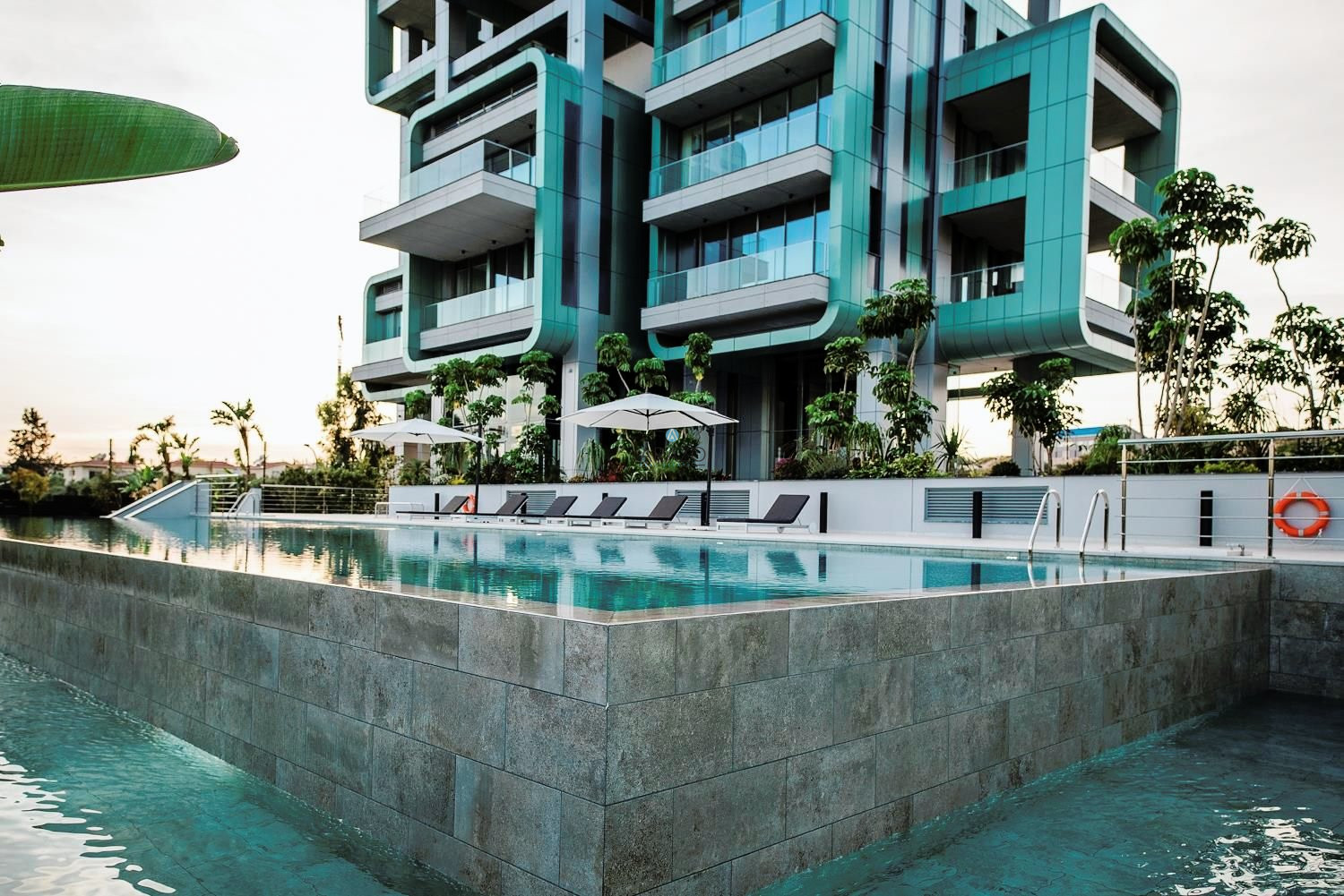 The concept behind this unique development is one of visual impact. Formed of two towers — reaching skyward to 82m and 70m respectively— this residential complex offers uninterrupted sea views from all apartments. The towers appear suspended over 6m-high glazed entrance lobbies, and are joined by the fully-enclosed 17.5m high Atrium, which contains two glass lifts. Clever use of height, glass and decorative facade materials combine to deliver a uniquely striking impact, and and allow the landscaped grounds to be integrated in the overall design strategy at lower levels. Set in a much sought-after location, the use of height has enabled the maximum amount of garden space to be created—further enhancing the appeal of this project. Additionally, it has a myriad of facilities such as, meeting rooms, gyms, gated entrance, olympic size swimming pool and much more that make it adequate for a pleasurable living.