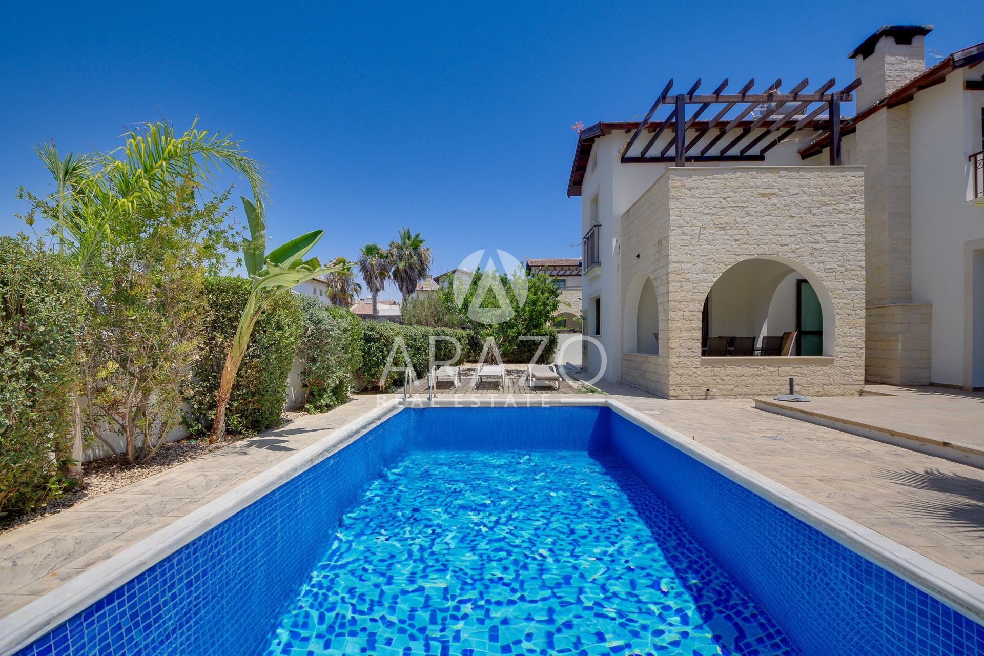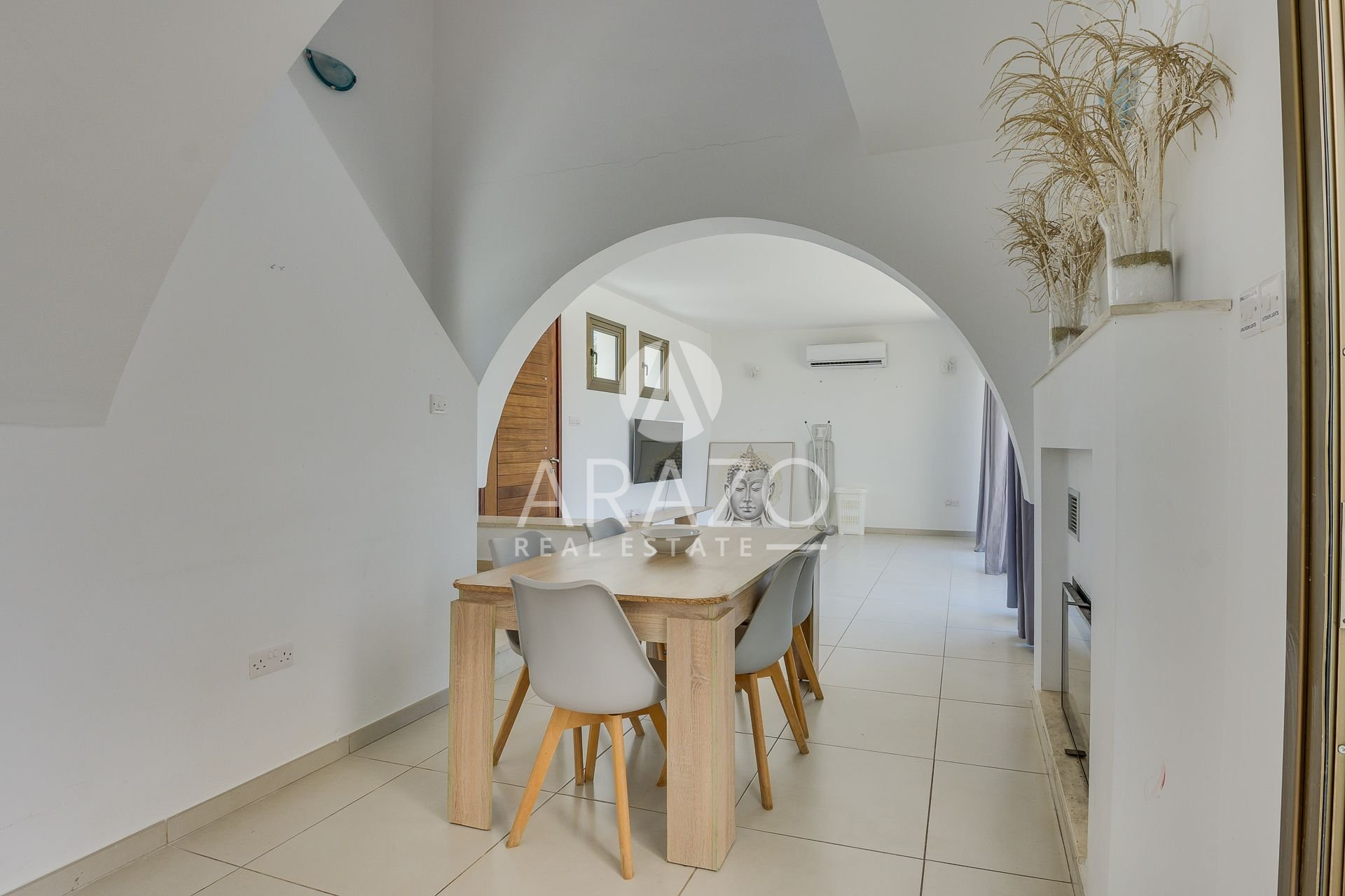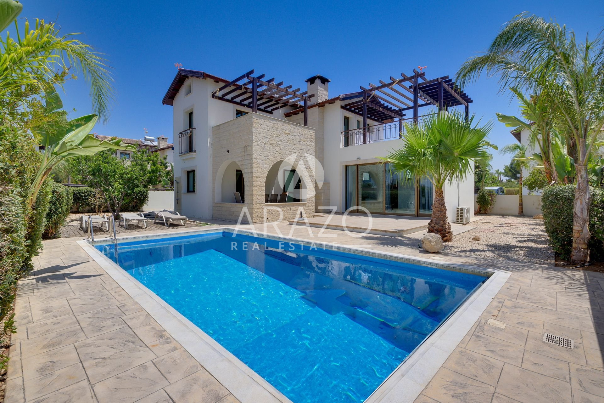 This unique in style villa features an open plan spacious living room with ample natural light and a built-in fireplace, a fully equipped kitchen and dining area. There is a bedroom on ground floor, as well as bathroom. First floor offers two good sized bedrooms and a shared family bathroom, as well as uncovered veranda with pergola. The villa benefits from a large private swimming pool and a spacious plot with lots of outdoor space.