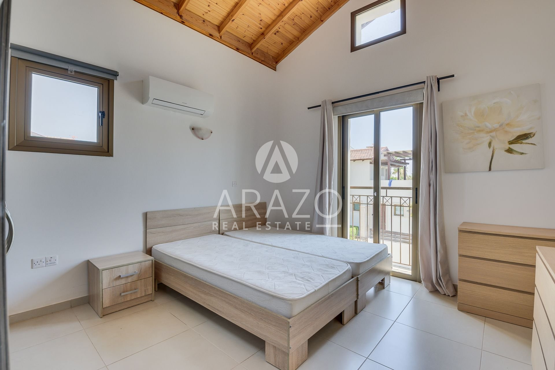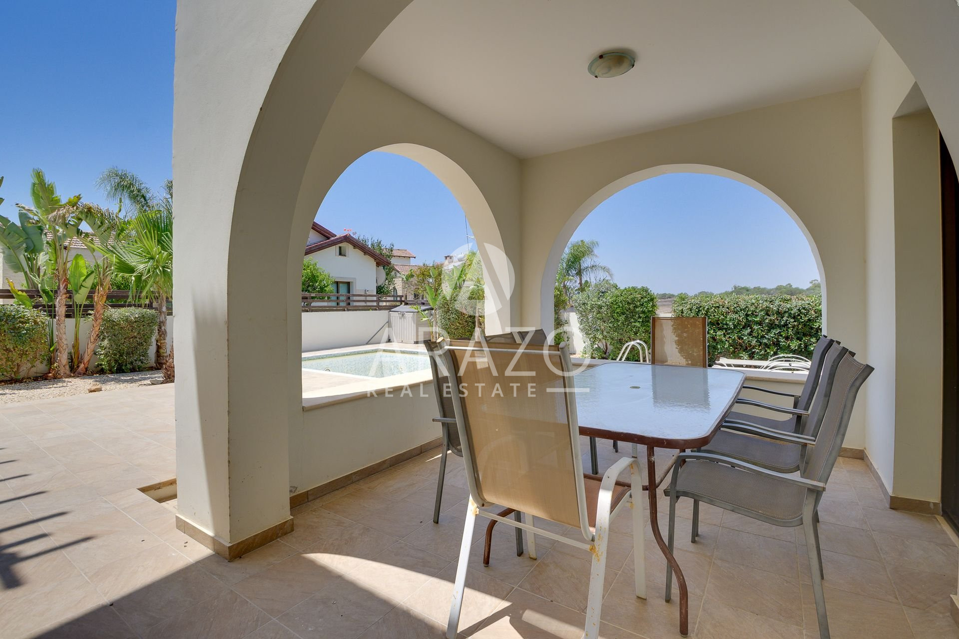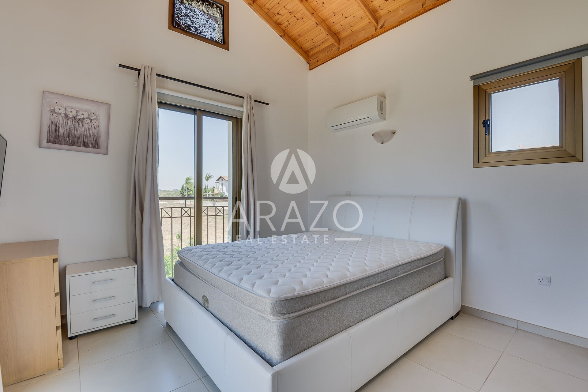 This unique in style villa features an open plan spacious living room with ample natural light and a built-in fireplace, a fully equipped kitchen and dining area. There is a bedroom on ground floor, as well as bathroom. First floor offers two good sized bedrooms and a shared family bathroom, as well as uncovered veranda with pergola. The villa benefits from a large private swimming pool and a spacious plot with lots of outdoor space.