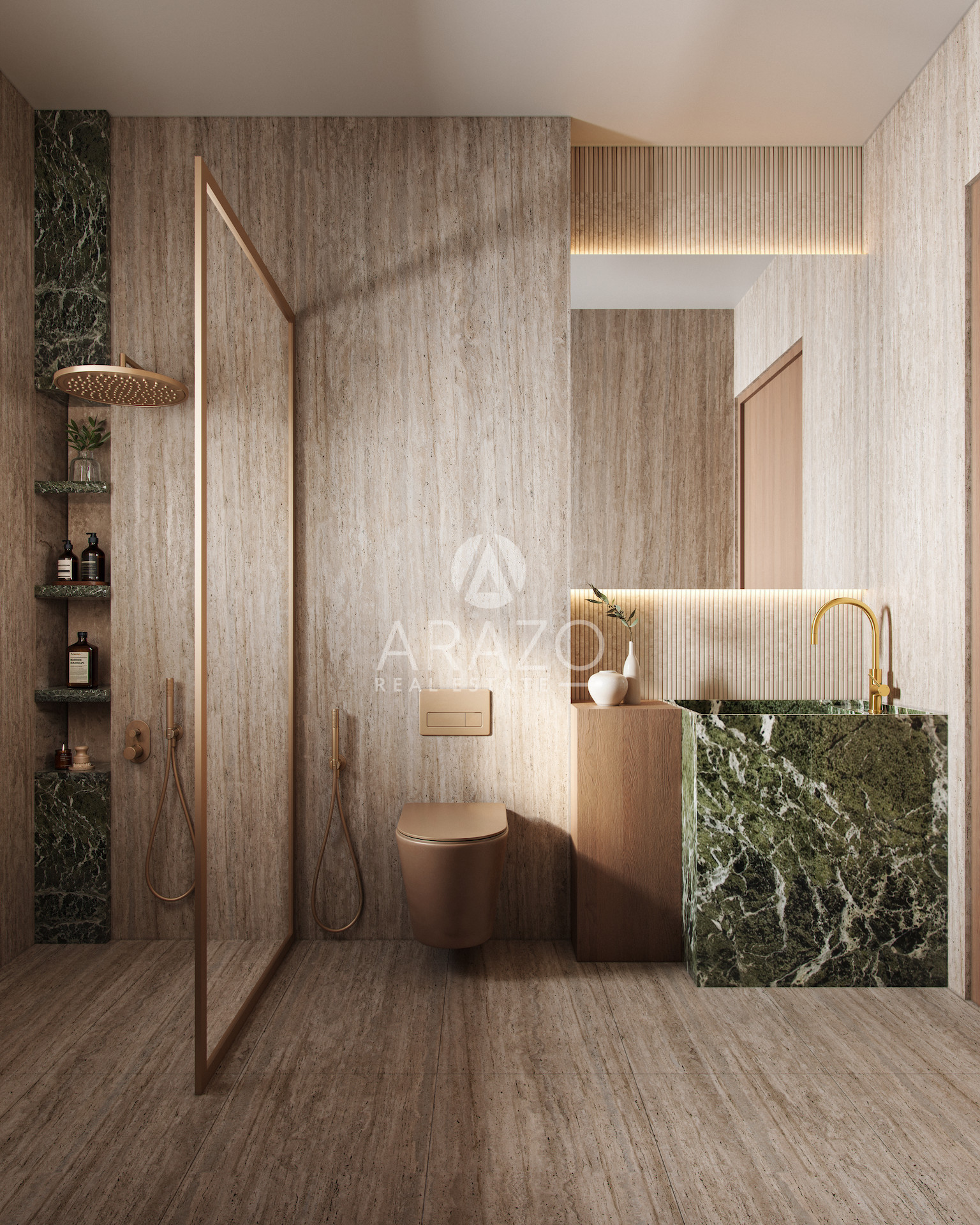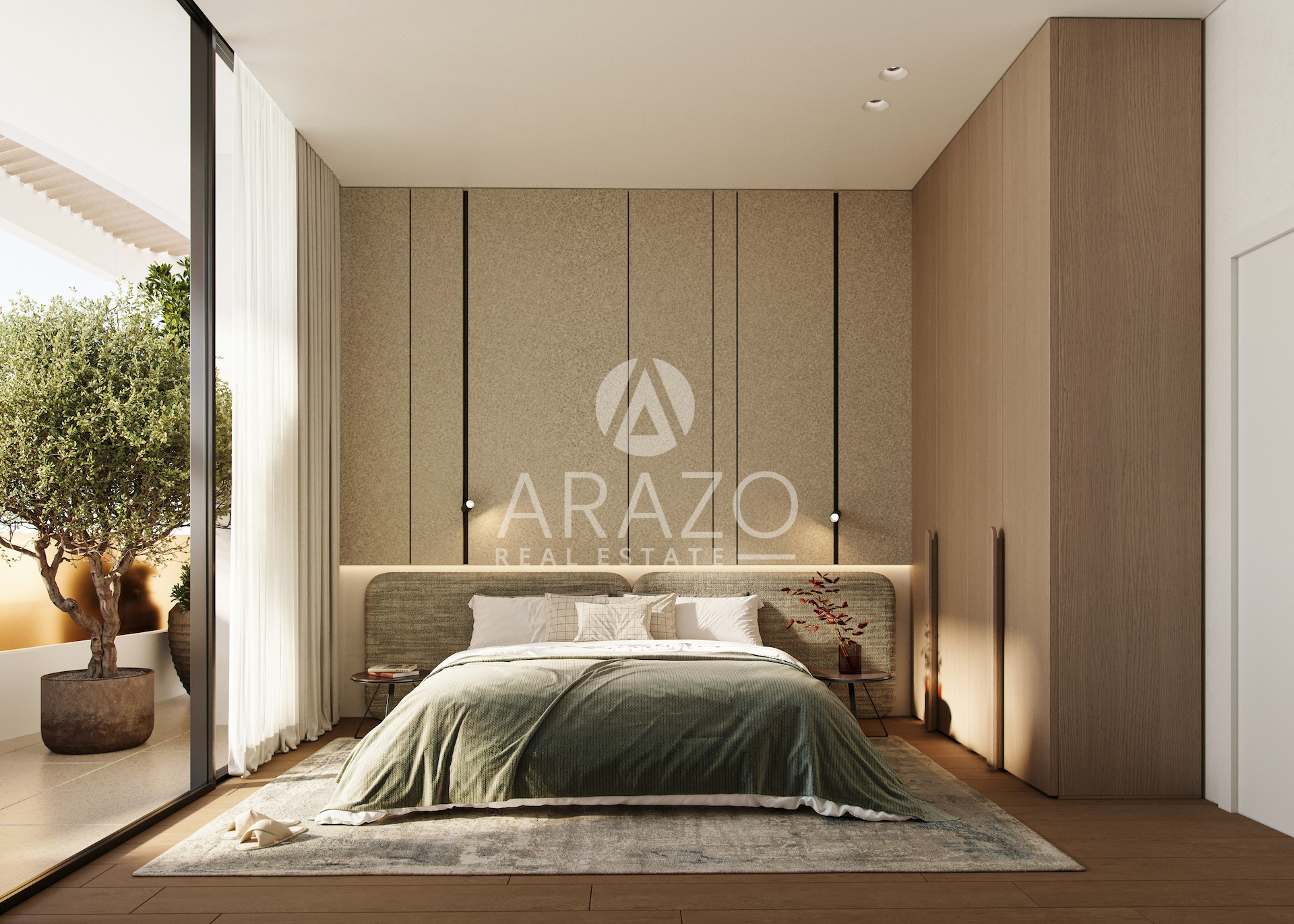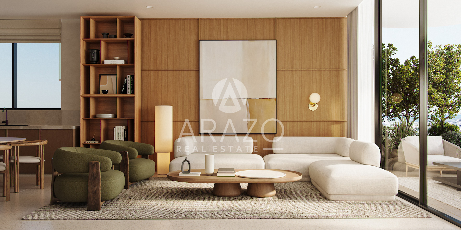 The contemporary exterior harmoniously blends materials and textures, while apartments in earthy tones and minimalist aesthetics feature premium finishes and large windows that flood the spaces with natural light, creating a serene, welcoming atmosphere.