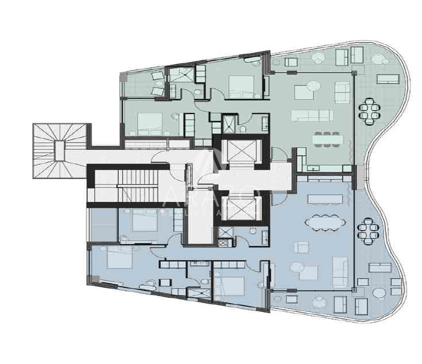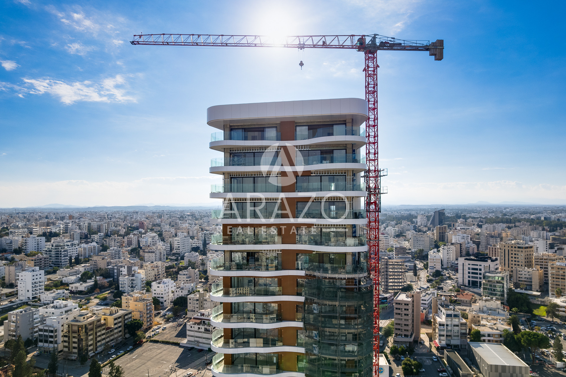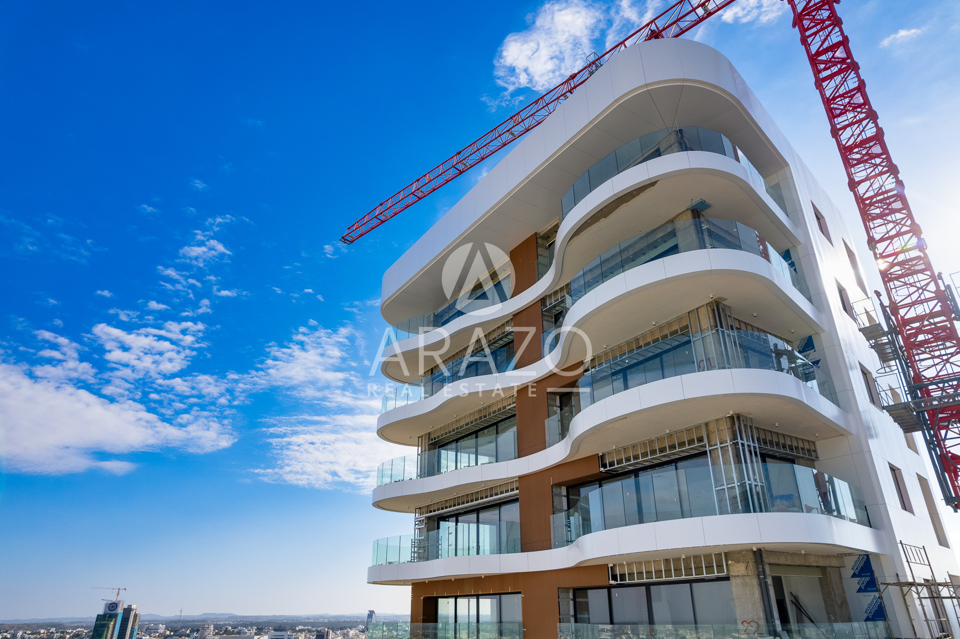 The building boasts a pure white façade, while the intertwining, organically bending curves of the balconies offer striking, uninterrupted views of the old city behind the Venetian walls and the surrounding Pentadactylos Mountain beyond. The uniquely designed balconies take advantage of sunlight, while forming an offset arrangement of living spaces that enhance privacy.