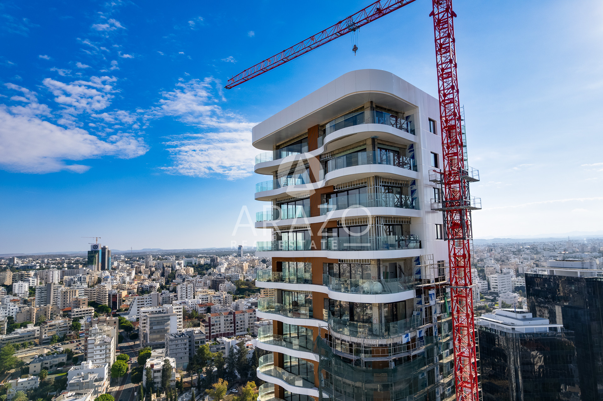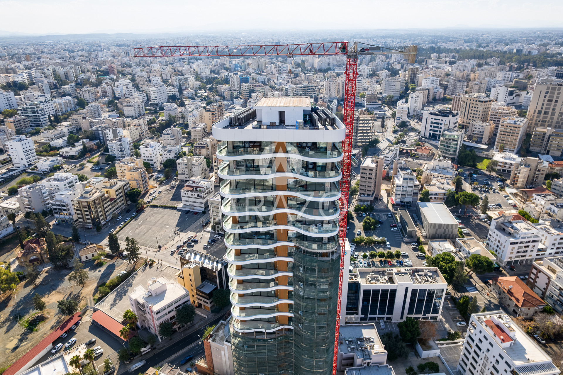 The building boasts a pure white façade, while the intertwining, organically bending curves of the balconies offer striking, uninterrupted views of the old city behind the Venetian walls and the surrounding Pentadactylos Mountain beyond. The uniquely designed balconies take advantage of sunlight, while forming an offset arrangement of living spaces that enhance privacy.