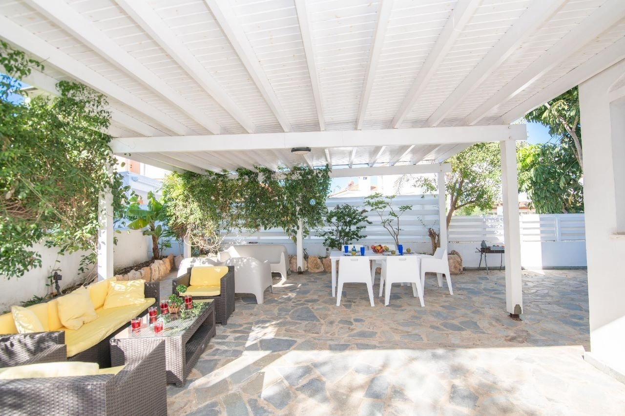 Luxury Myconian style house 130 meters from the sea with stunning sea views and a private swimming pool. Ideally located between Sirena Bay (300m), Golden Coast (600m) a 5-star hotel with full amenities such as spa and tennis, and Crystal Springs Hotel (400m) known for its Mediterranean landscaped seafront gardens and quality beach. You can enjoy indoor dining during the day as well as outdoor dining in the front garden at night. Enjoy a breathtaking sunset on the roof garden and unwind.