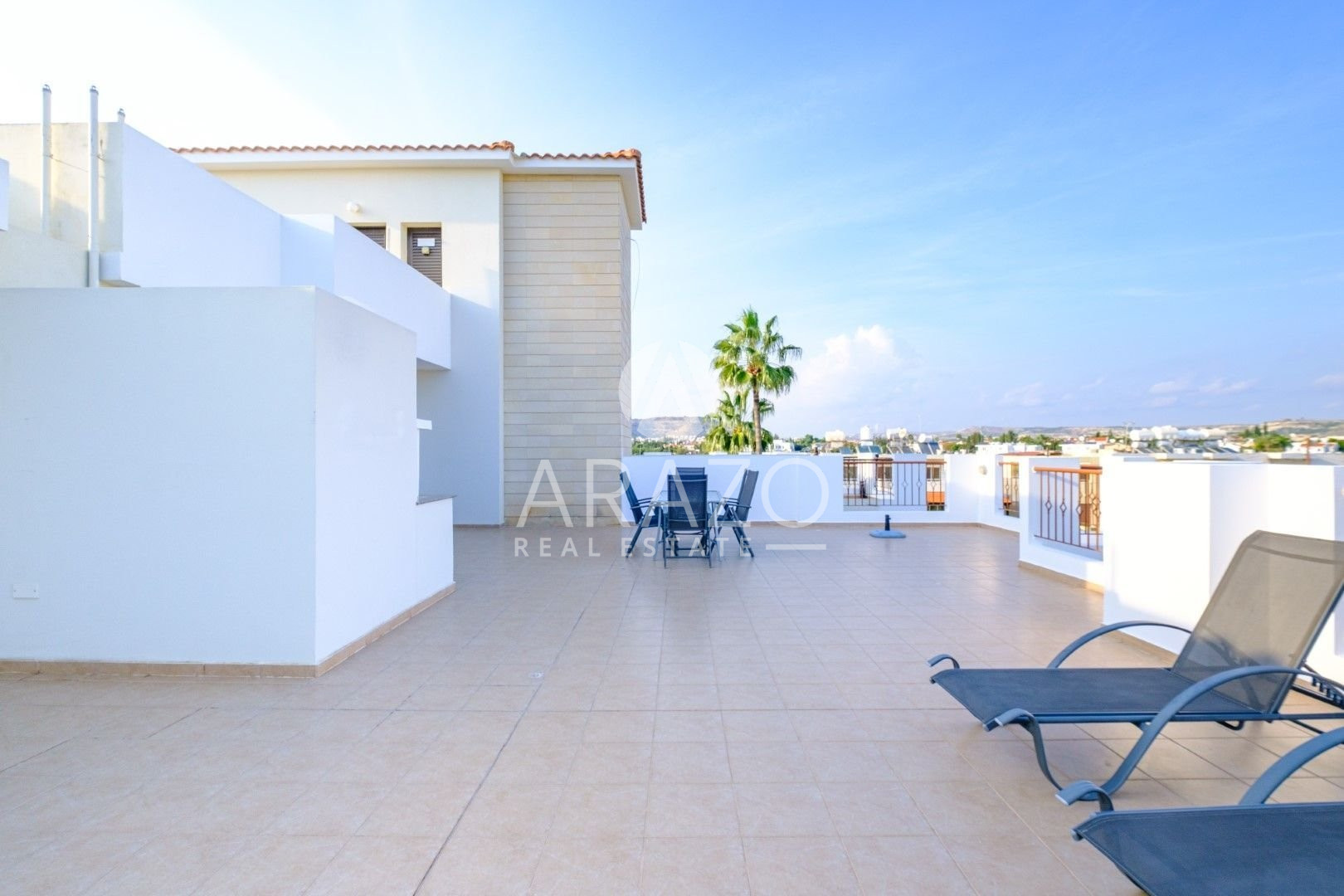 The property is located on the second floor of the apartment building and consists of an open plan living and dining area which is unified with the kitchen, two bedrooms, en - suite shower with toilet in the master bedroom, a main family bathroom with toilet, covered veranda and huge roof garden. Fully furnished, equipped kitchen, A/C split unis, BBQ space and covered parking space.