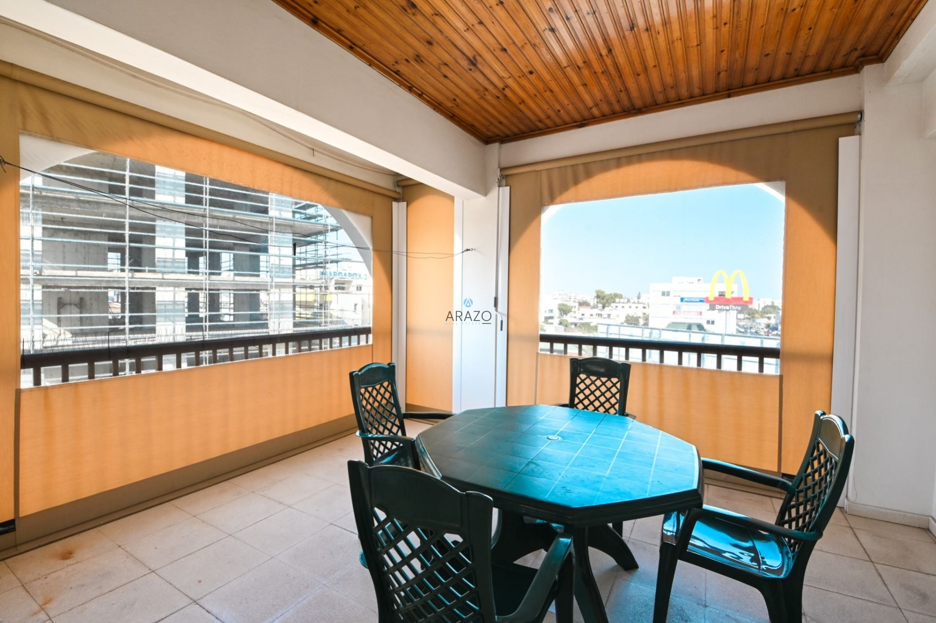 The property is located on the third floor and it is consists of an open plan living and dining area, separate kitchen with dining space, three bedrooms, two bathroom with toilet and a huge covered veranda with barbeque space. Fully furnished, fully equipped kitchen, A/C split units and covered parking space.