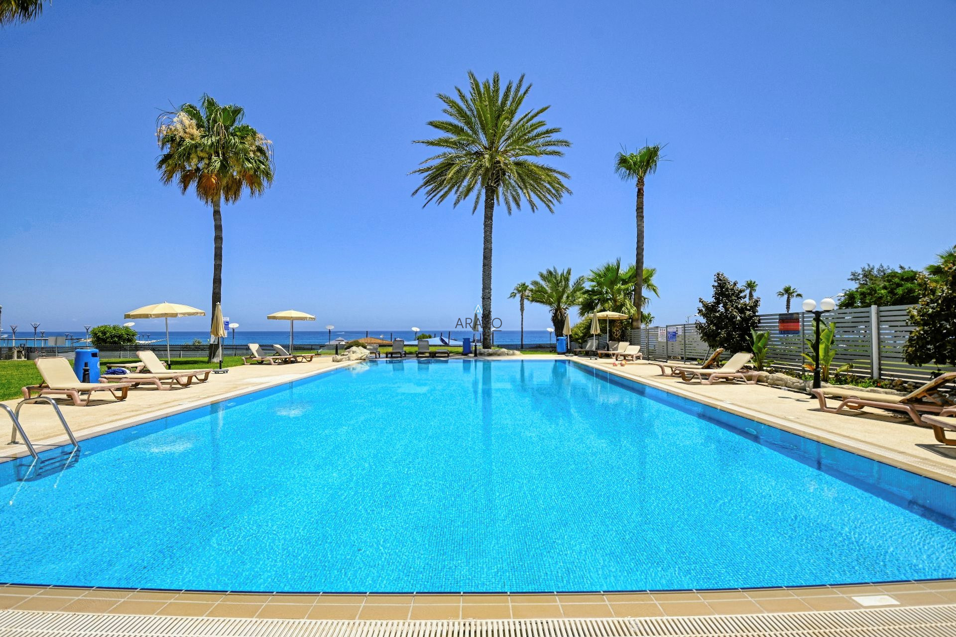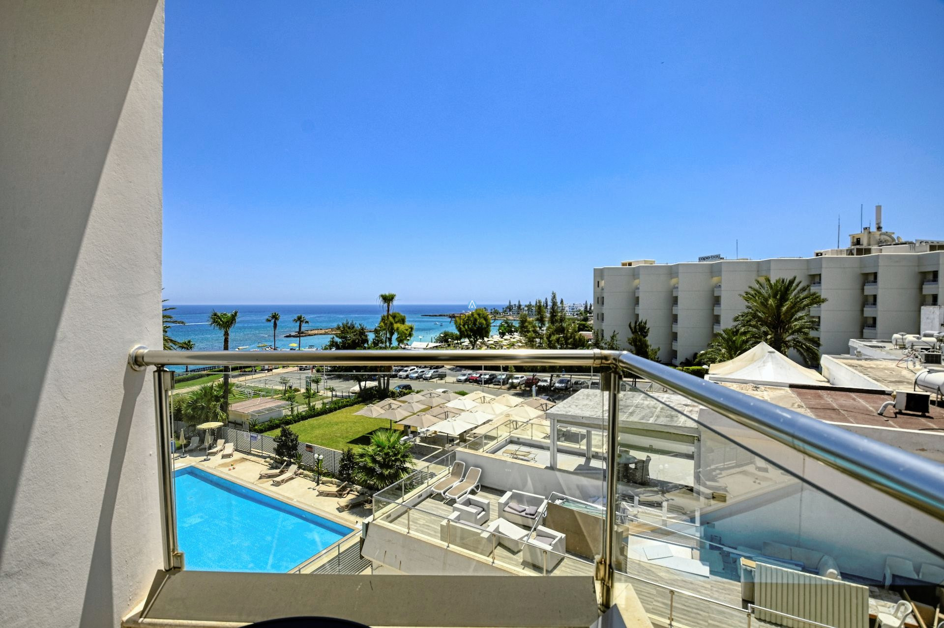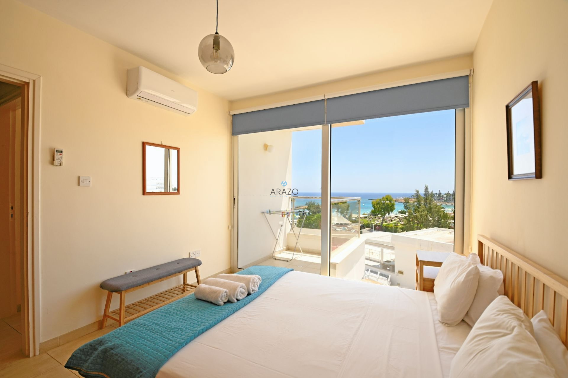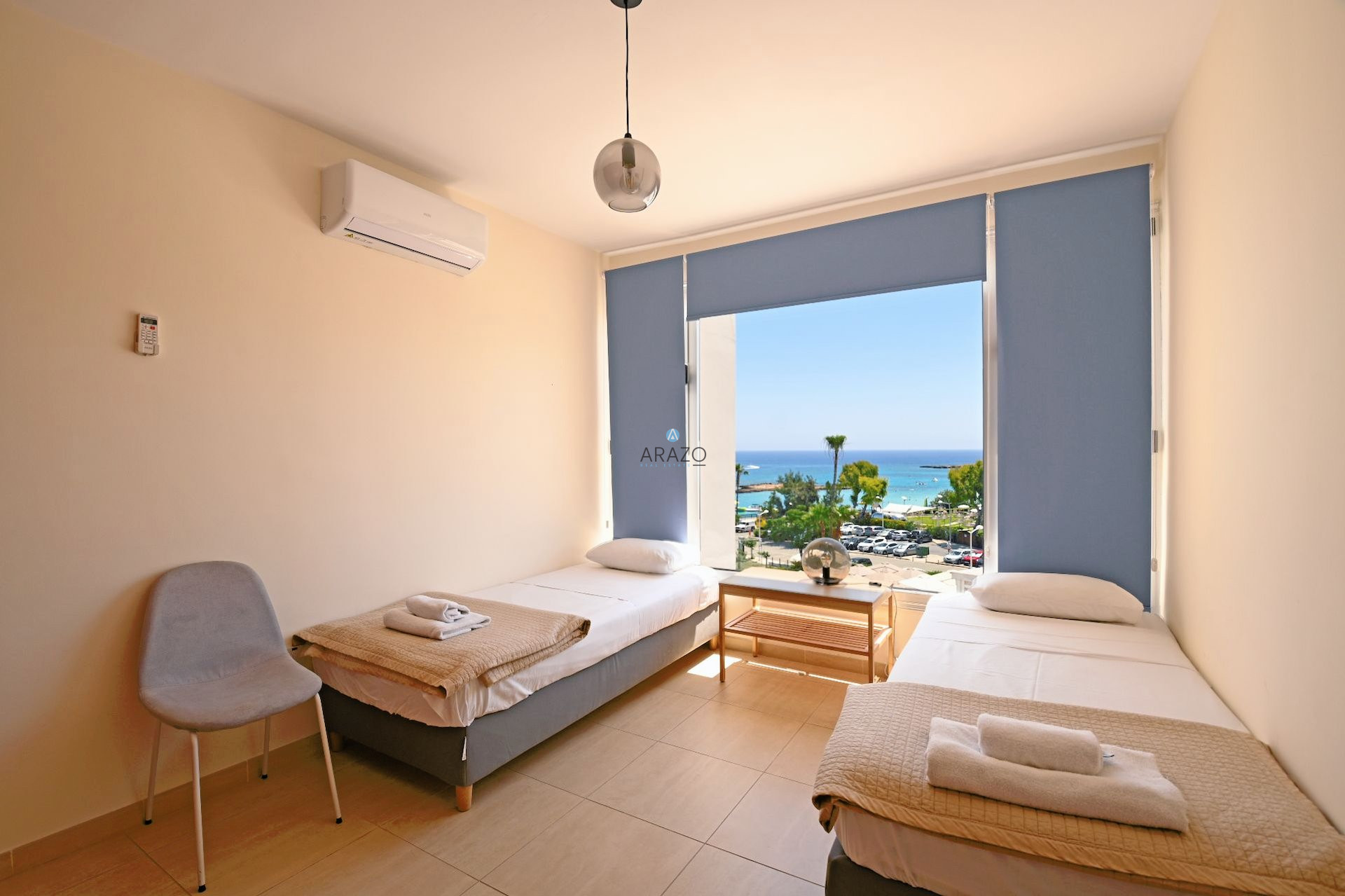 A spacious, beautiful two bedroom apartment, located in the very center of Protaras next to famous Fig Tree Bay. Being first line to the beach, the apartment has a breathtaking panoramic sea view from the living room and bedrooms.