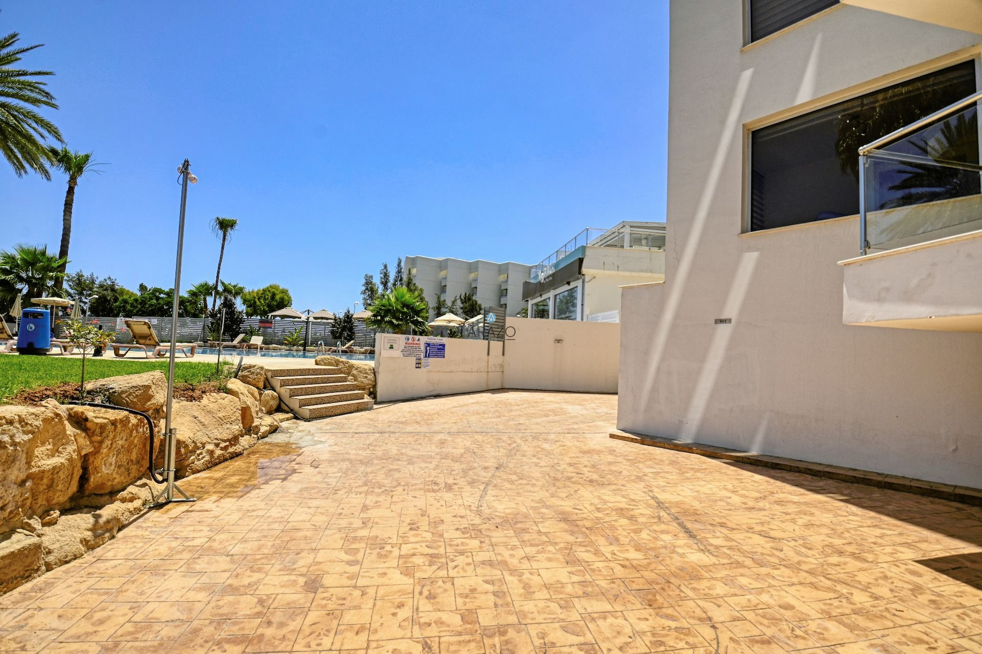 There is one uncovered allocated parking space. The building has a shared swimming pool and a yard with green grass.