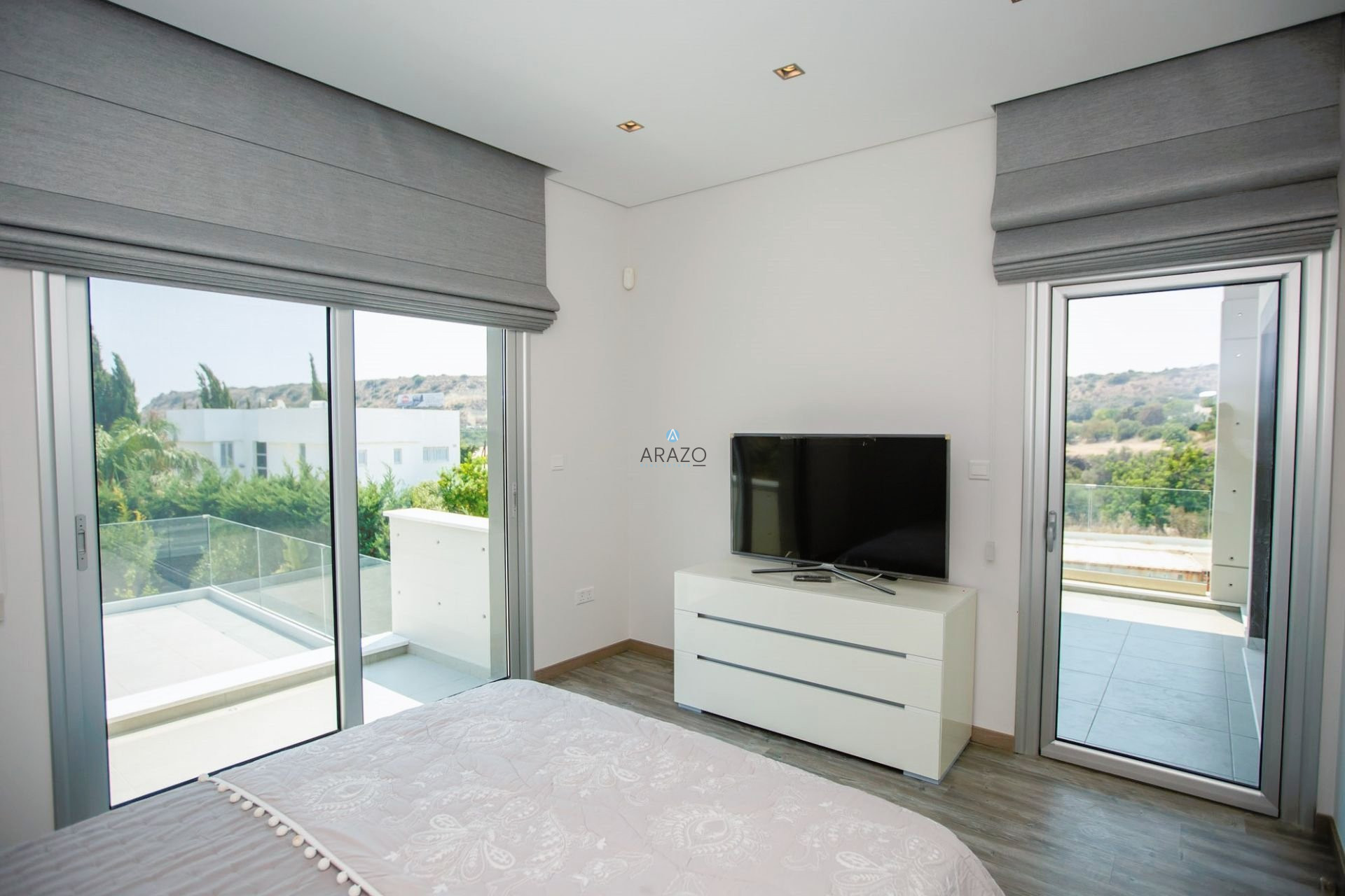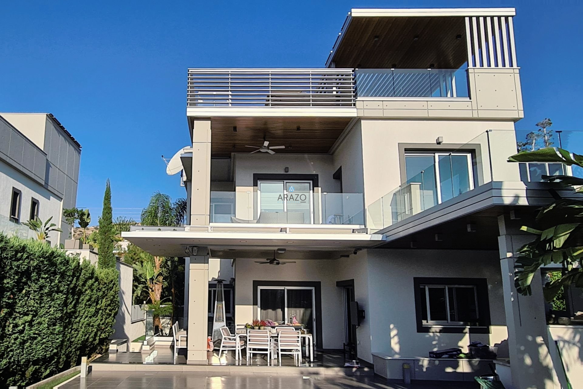 Modern 4 bedroom villa in the prestigious area of Agios Tychon, close to all necessary amenities and infrastructure and within easy reach to the sea, just 1000m. The villa resides in a plot area of 590 sq.meters with an internal area of 275 sq.meters. Villa consists of three floors plus covered Roof garden and four bedrooms in total accompanied by one maid’s room / guest studio. Villa is fully furnished and equipped.